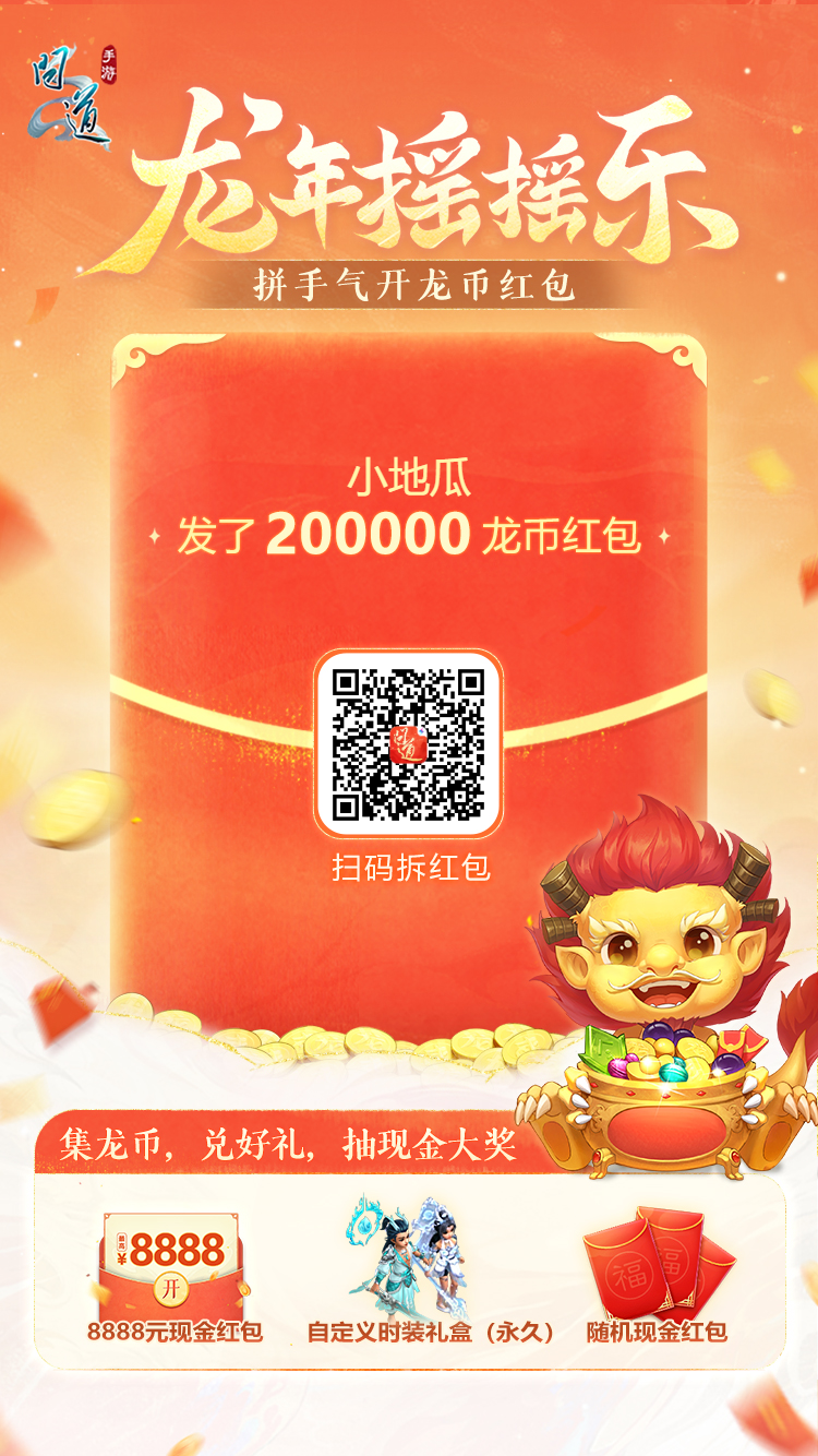拜年不空手!今天为大家带来了 除夕专属的龙币红包!快扫描二维码领取,拼拼手气,先到先得!