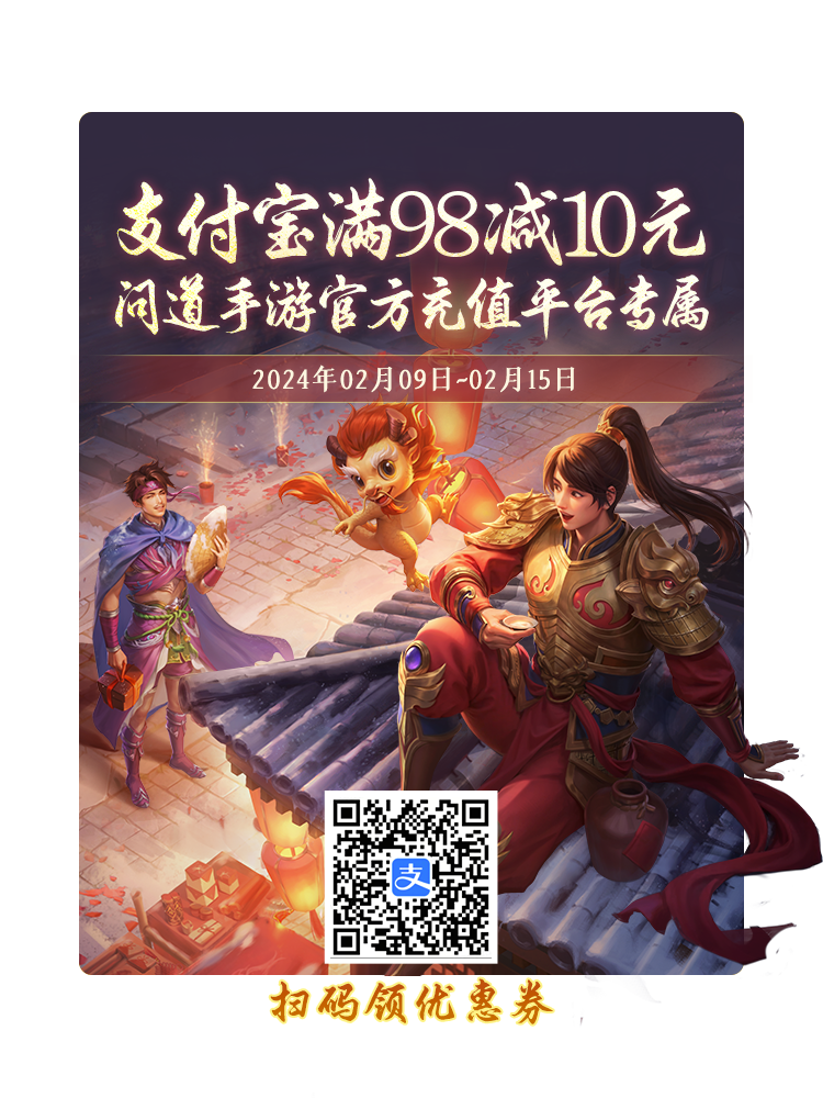 好消息!2月9日08:00-2月15日23:59,充值平台开启支付宝满98-10的活动,扫描下方二维码即可领取优惠券,一共10000张!先到先得哦~