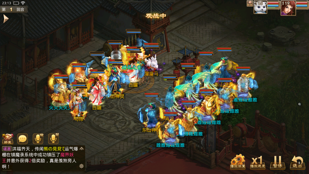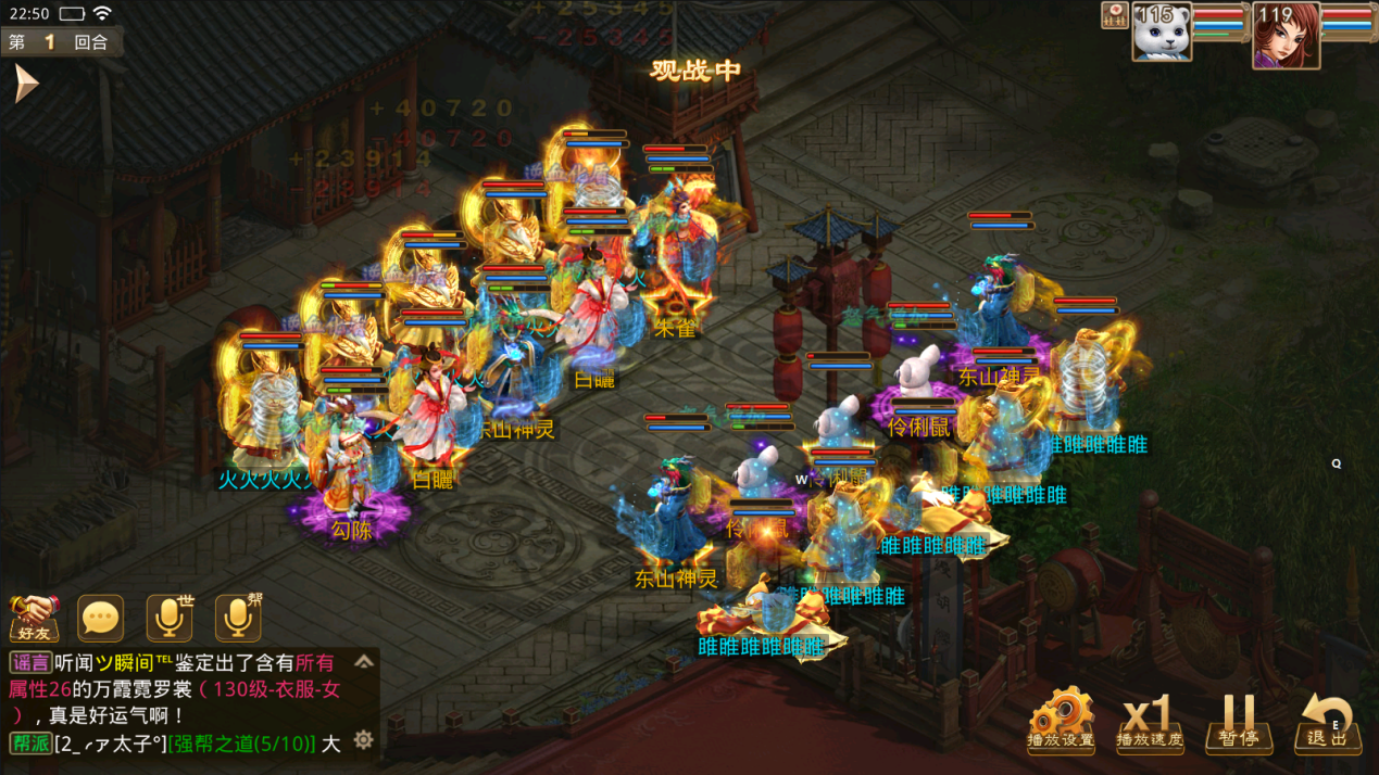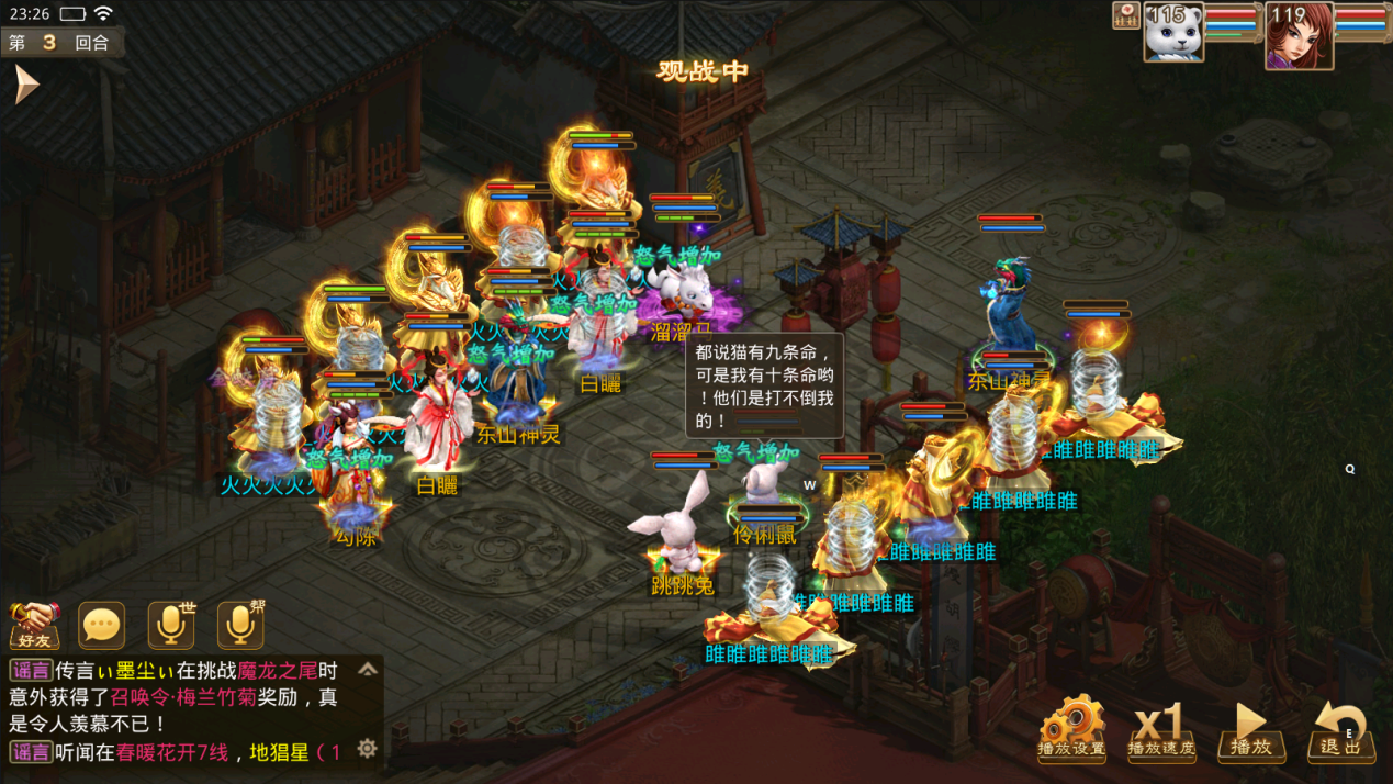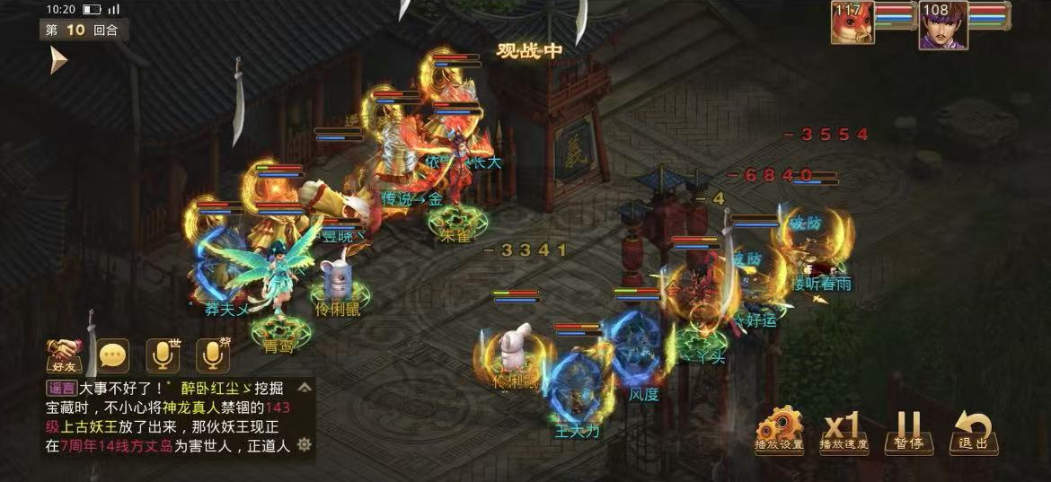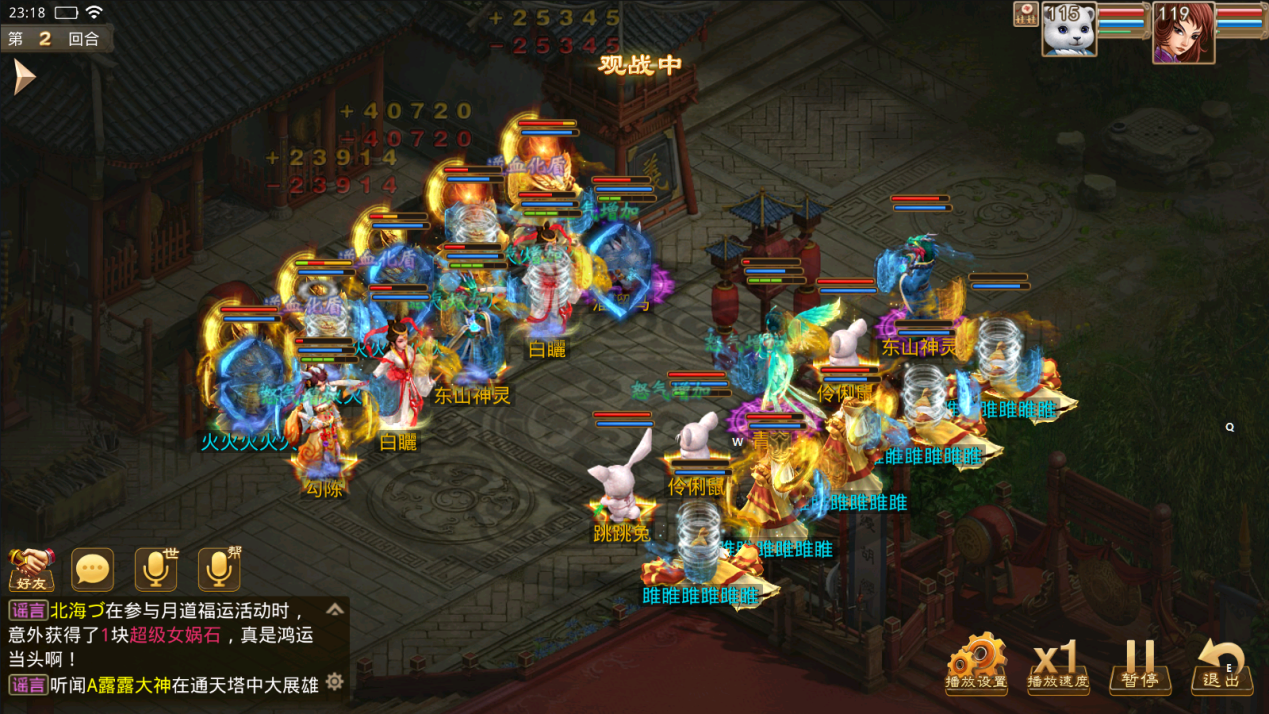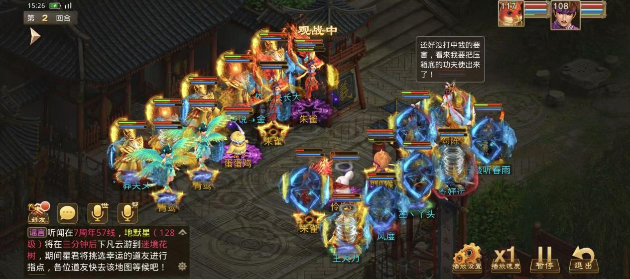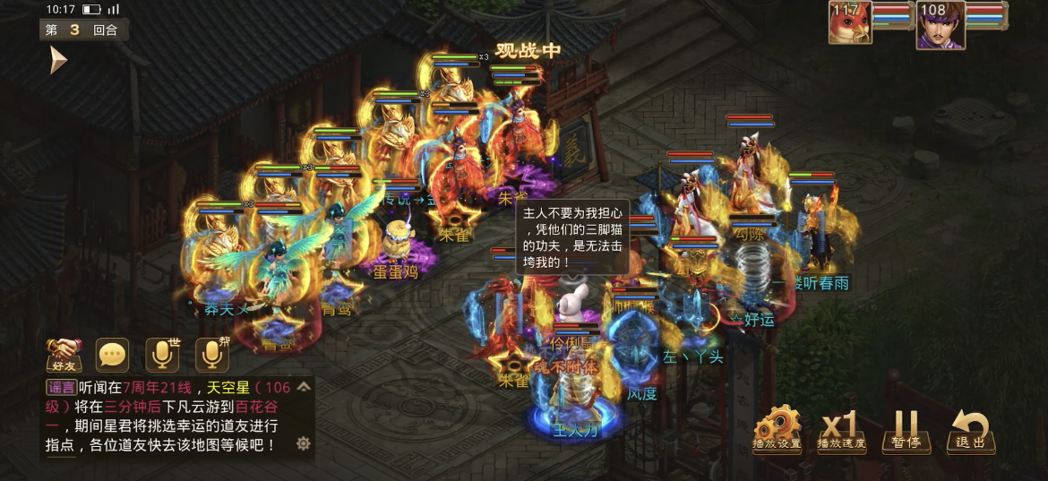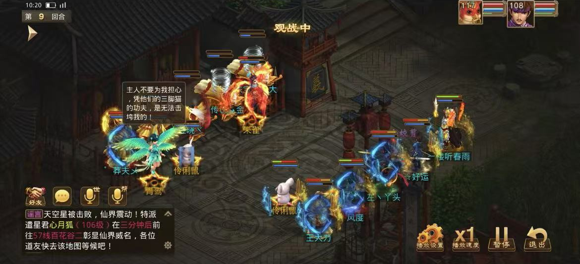 第2回合,双方宠物游说和上十万火急等技能,观战方敏火起了一手鼓舞士气,对战方双控出手直接障碍了观战方8个目标,力输出触发连击,法输出进行收尾并且触发番天印,成功带走1只宠物并将未被障碍的角色击倒。