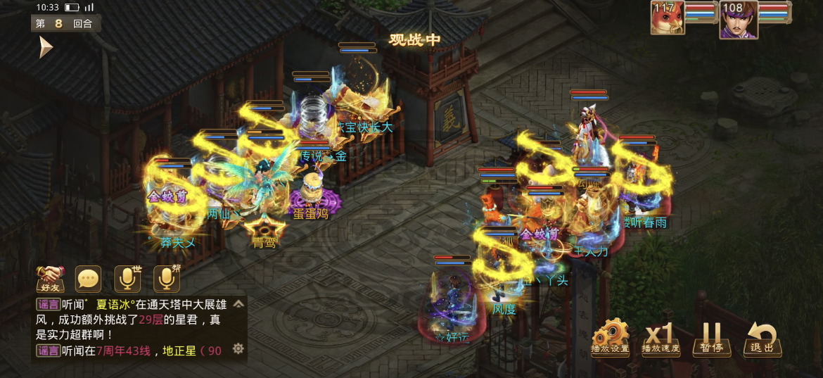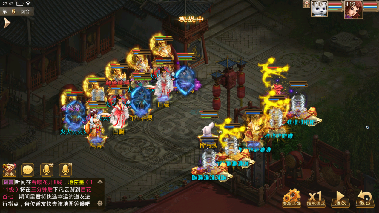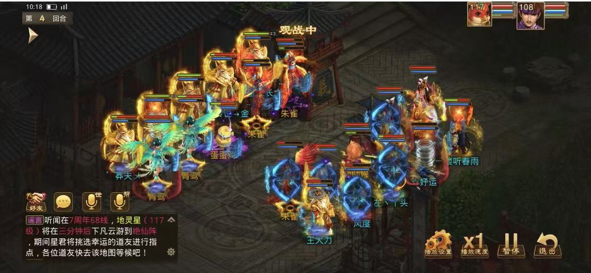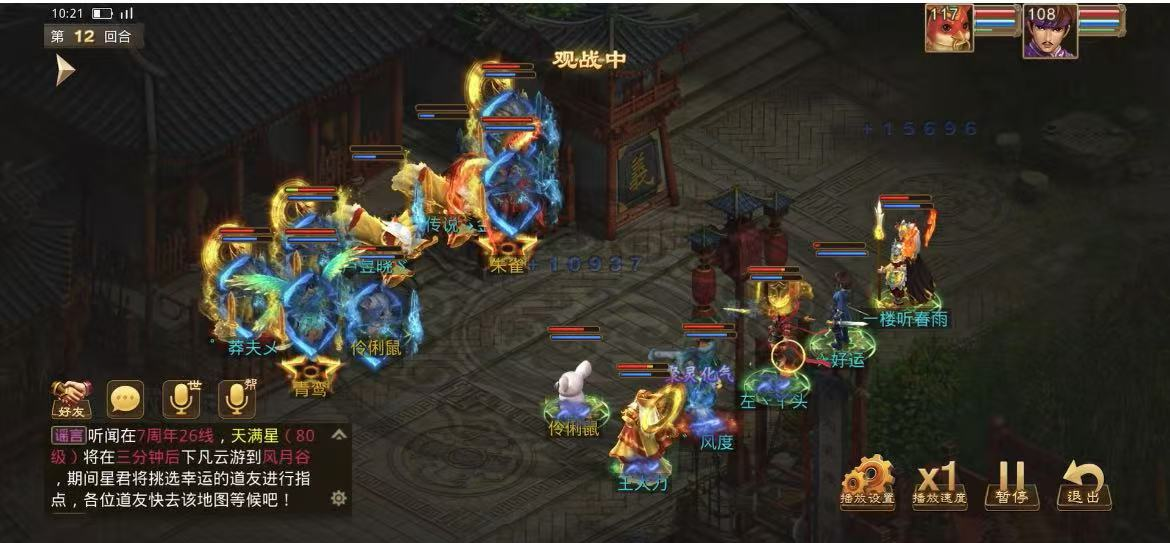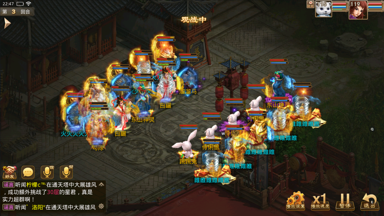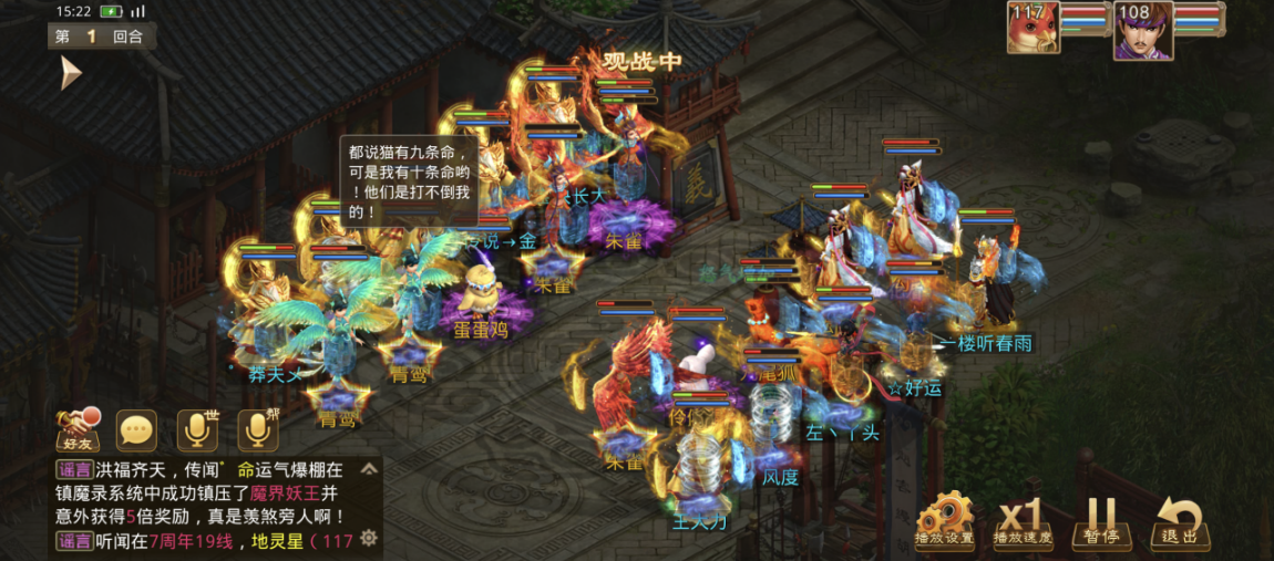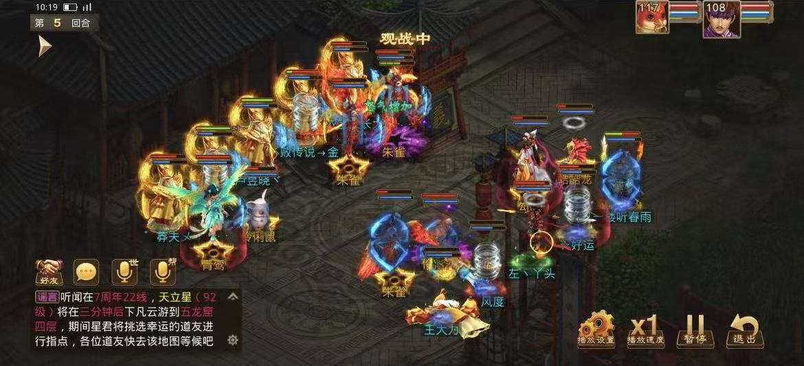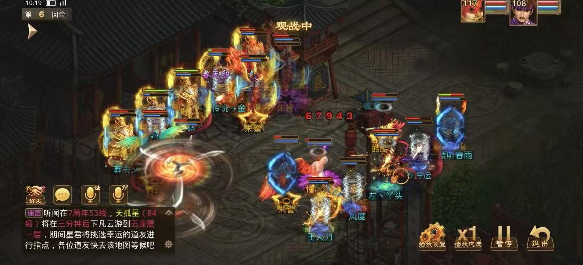 第2回合,双方宠物游说和上十万火急等技能,观战方敏火起了一手鼓舞士气,对战方双控出手直接障碍了观战方8个目标,力输出触发连击,法输出进行收尾并且触发番天印,成功带走1只宠物并将未被障碍的角色击倒。