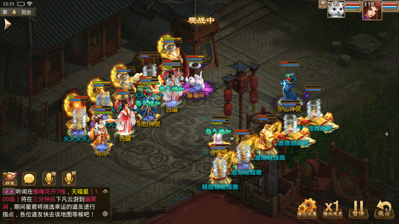 第4回合,对战方利用宠物破昏睡障碍状态,双控出手进行障碍,使得观战方8个单位处于被障碍状态,对战方法水出手并未造成强有力的伤害且把被睡的宠物打醒,力输出出手虽然触发混元金斗但是主目标被冰冻,未能带走宠物和角色。观战方宠物拉人,双输出出手,带走了对战方1只宠物。