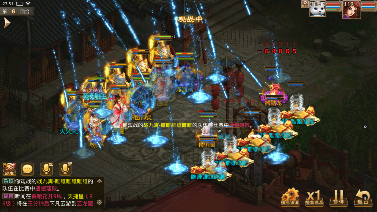 第6回合,观战方老鼠舍身拉起控水,对战方力火上固本培元,敏火上坚毅壁垒,力输出出手并且触发混元之力和斗子,直接带走2名残血角色,同时对战方宠物闻风丧胆成功使得观战方控水无法出手障碍,法水也触发混元之力和番天印,直接带走2只宠物和控水,拿下了本场比赛的胜利。