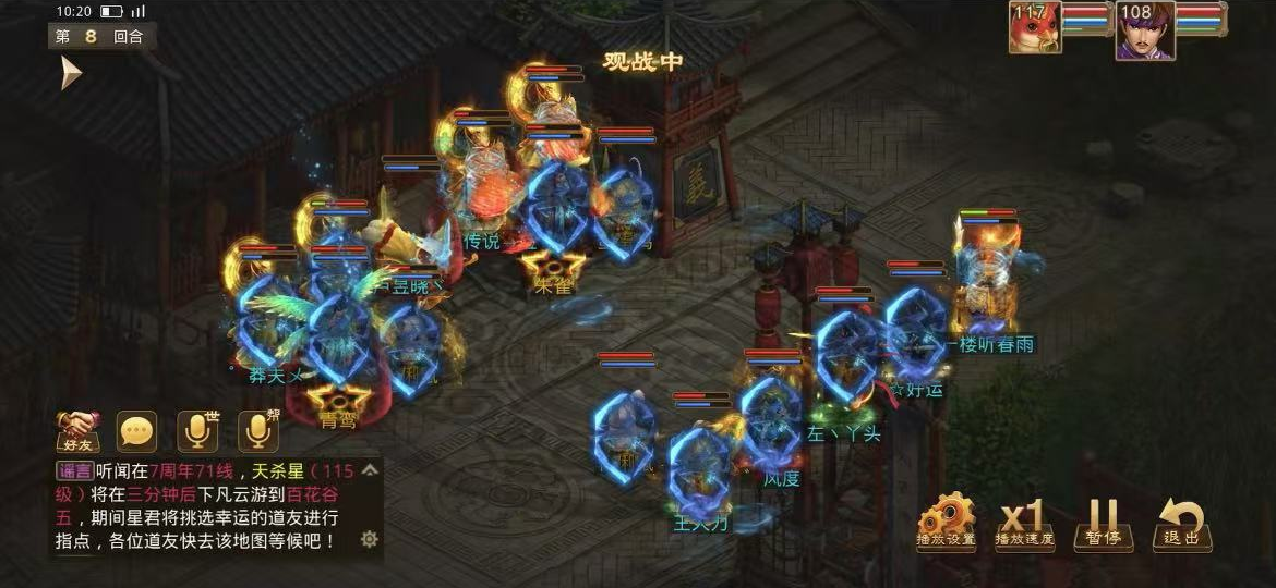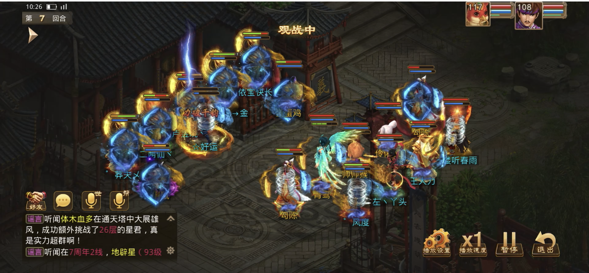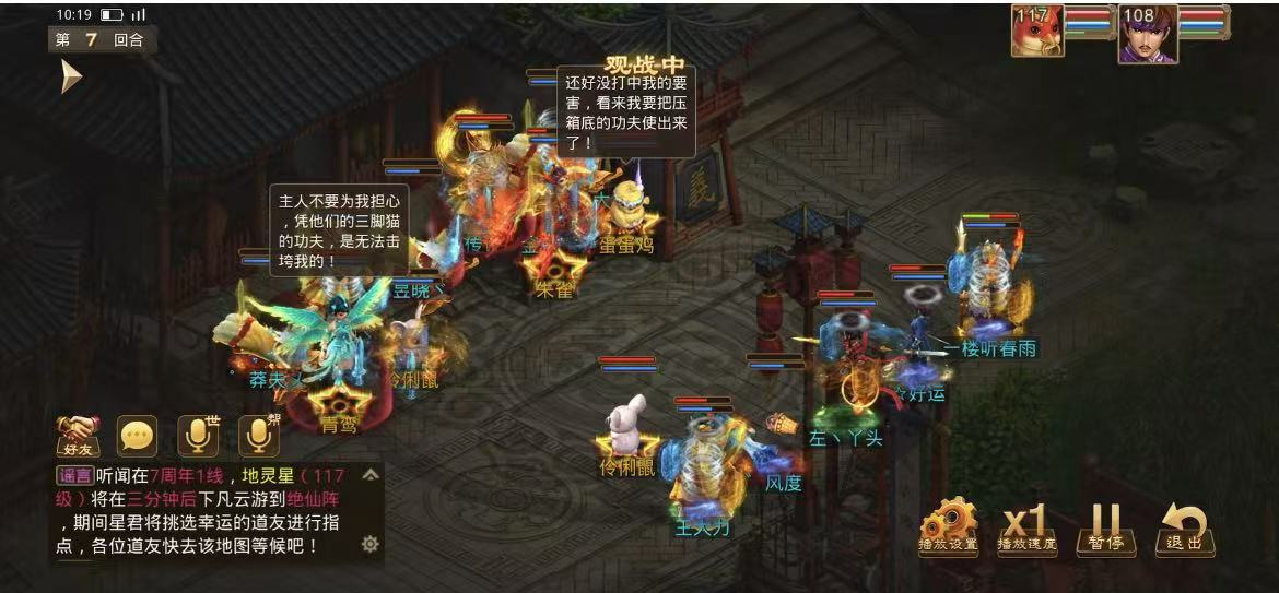 第7回合,观战方控水在被障碍和闻风的情况下,选择拉一手固本培元,控火障碍上4个单位。双方宠物游说,对战方控土出手成功障碍上3个单位,力木输出直接带走2只宠物,使得观战方仅剩1只副宠老鼠,这时观战方法水出手并且触发混元之力和番天印,带走1只宠物和3名角色。