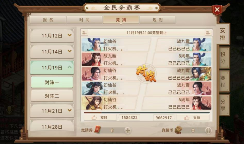 大家记得为你心仪的队伍投上一票,若支持的队伍获胜,还可额外获得竞猜币奖励,使用竞猜币可以在竞猜商城中,兑换各种道具奖励。