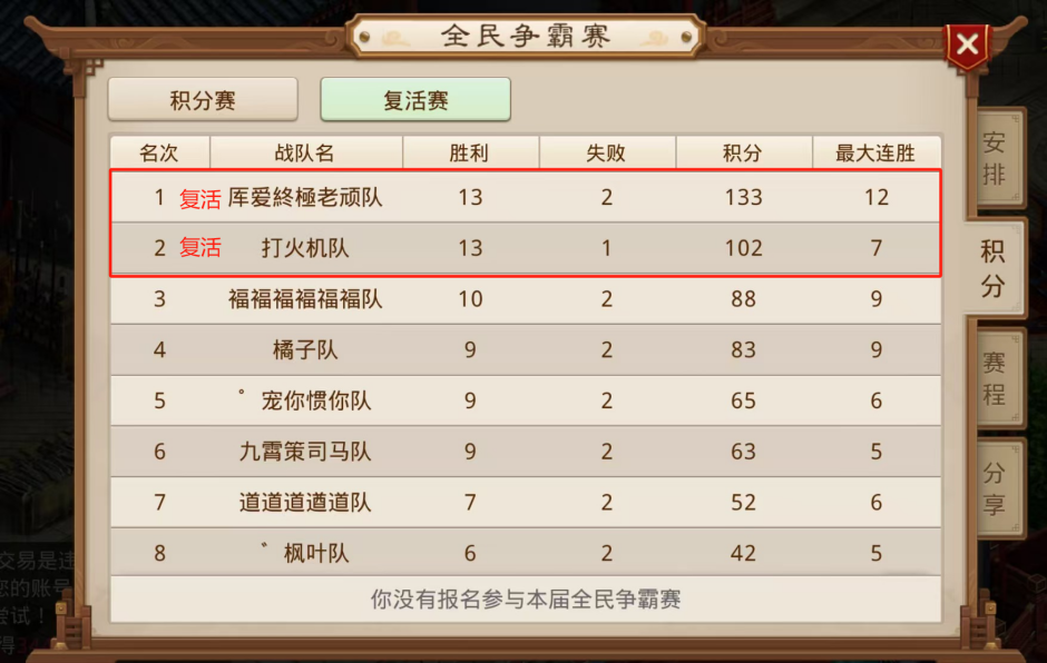 第1名:厍爱終極老顽队伍,以13胜12连胜、133积分的成绩成功复活。他们在积分赛取得了10场胜利,在淘汰赛32进16中被披荆斩棘队击败。他们的队名似乎是系统随机的名字,一开始并没有得到太多关注,但是依靠超高的积分成功复活,引起了大家的注意。