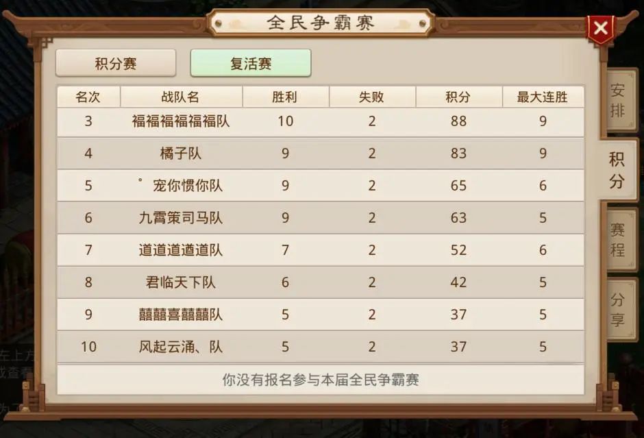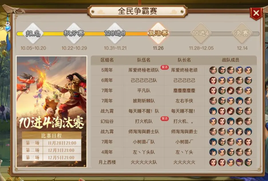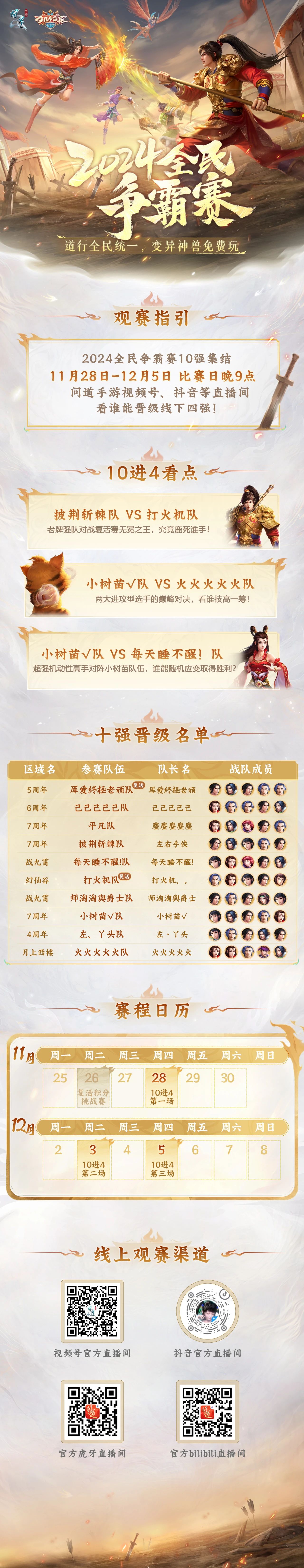 最后来看一下最终的10强名单,他们将进行为期3天的车轮排位赛,每支队伍每天都有3场战斗,共计9场。最终积分最高的4支队伍将晋级4强,前往线下参加全民争霸总决赛。