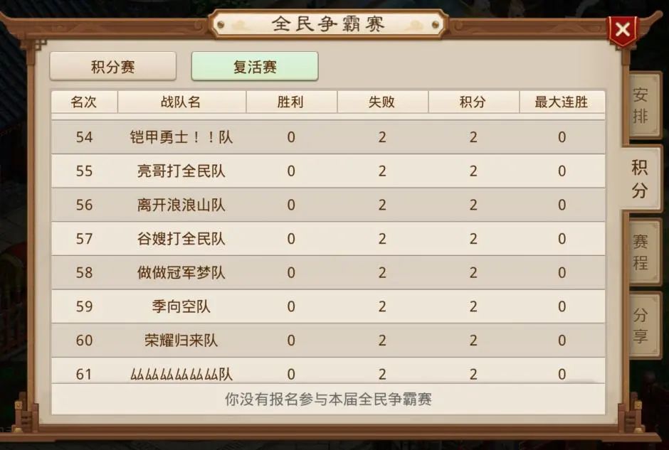 120支队伍里,一共有94支参加了本次复活赛,有41支队伍没能在复活赛取得胜利,0胜结束了本届全民争霸赛,其中包括了去年亚军、前年季军的天泽队,赛前认为会是复活热门的海天赋队(改名季向空队),刚刚倒在16进8的雎睢雎雎雎睢队,在很早之前就看好的厸厸厸厸厸厸队、谷嫂打全民队。