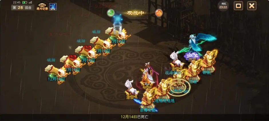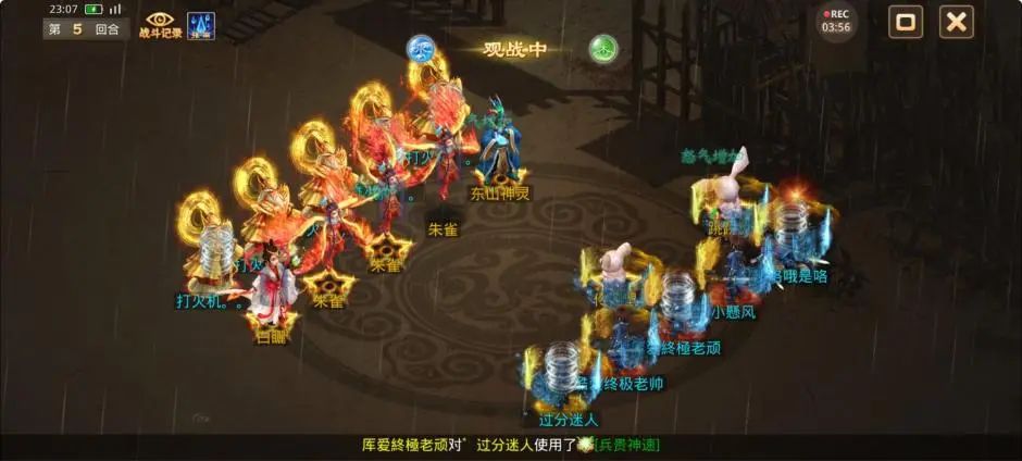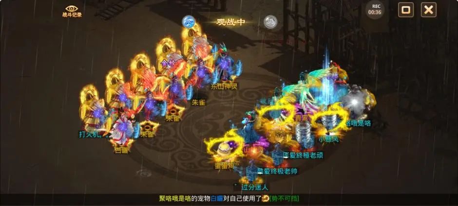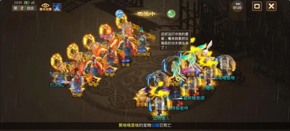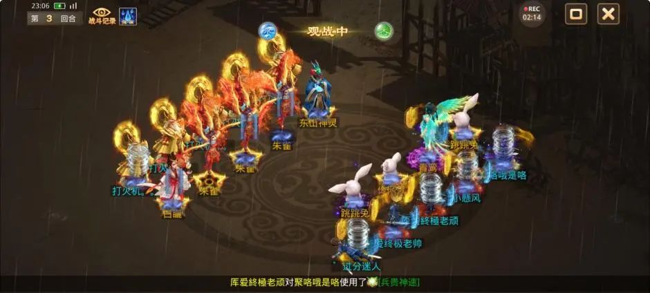 观战方控水使用静心凝神,观战方被游说、被颠倒错乱的敏火终于拉上了速度。尽管观战方在努力的寻找机会,但是宠物感人的复活率使得本就开局劣势的他们更加雪上加霜,3回合被清掉4只神兽1只变异。