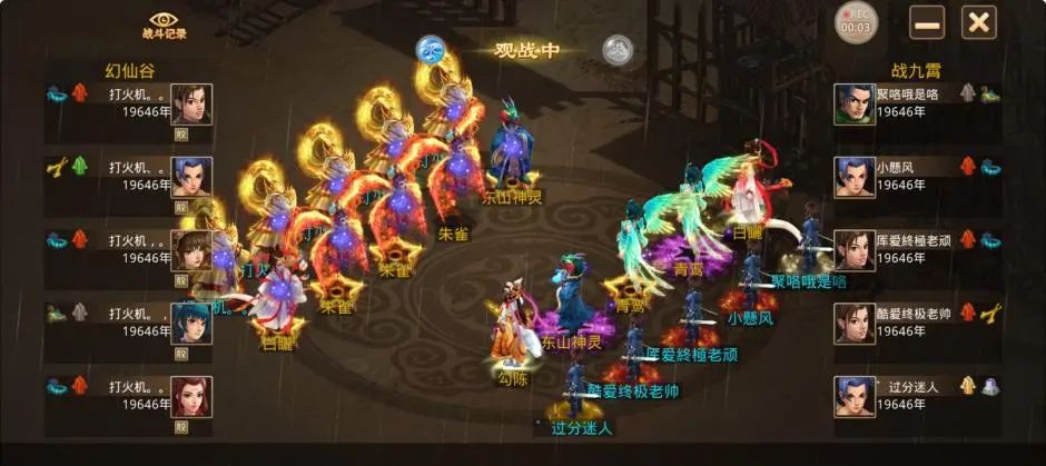 第3回合,对战方控金触发势不可挡但是没能障碍成功,观战方的宠物选择游说另1个敏火,被游说的力土出手虽然触发连击但是遇到宠物触发仙风,并没有带走或打倒对战方的人物和宠物,对战方的力水用自己的朱雀将自己打醒,随后出手触发混元金斗,打死了1只变异和2只神兽的同时还将法水打倒。