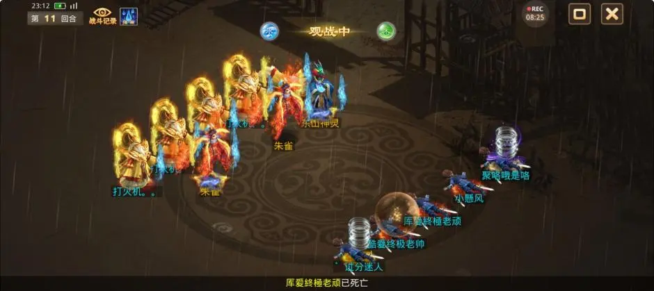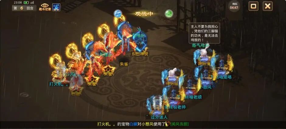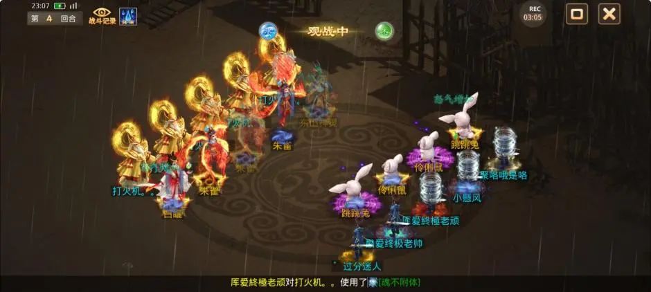 第4回合,观战方2个敏火都选择障碍,将力土控水和3只宠物成功昏睡,东山和朱雀对控水和控火成功使用闻风丧胆,2个力水出手后2只变异复活,仅剩的神兽青鸾也被打死,观战方仅有没被障碍也没被闻风但是速度最慢的敏火出手,只睡上了对战方2只宠物和控金。