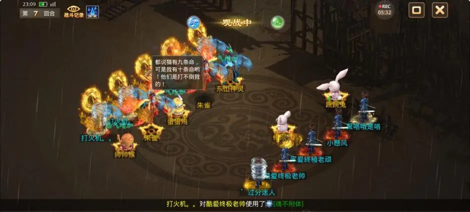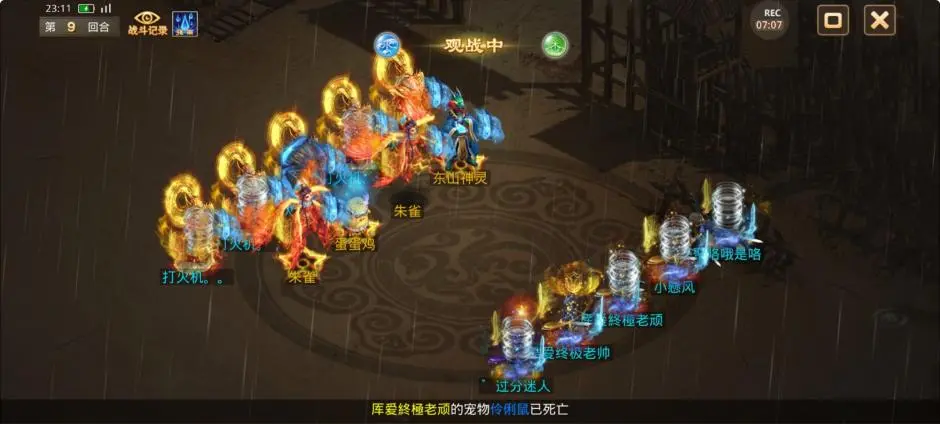 第7回合,对战方使用第2次固本培元,观战方被闻风的控水拉防,解除游说的力土出手,成功将3只神兽打死,其中1只复活,法水出手只打死了1只蛋蛋鸡但复活,控火出手成功昏睡4只宠物和2个力水,对战方漏在外面的控火也出手昏睡上4个人物和2只宠物,回合结束触发降雨。