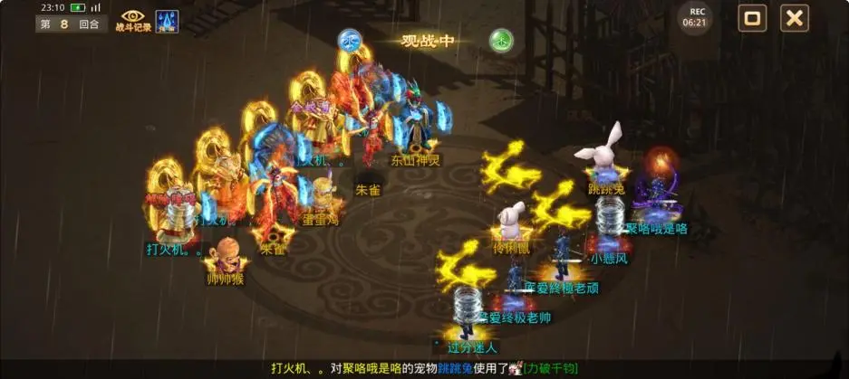 第8回合,观战方敏火在没被游说的情况下拉上速度,控水冰上了3个人物,力土和法水出手打死了1只变异和朱雀但均复活,控火出手睡上了2个人物和1只宠物。对战方被冰的敏火使用坚毅壁垒为己方加上护盾,宠物将力土和控水成功游说,被冰的力水触发势不可挡,但是没有造成击倒。
