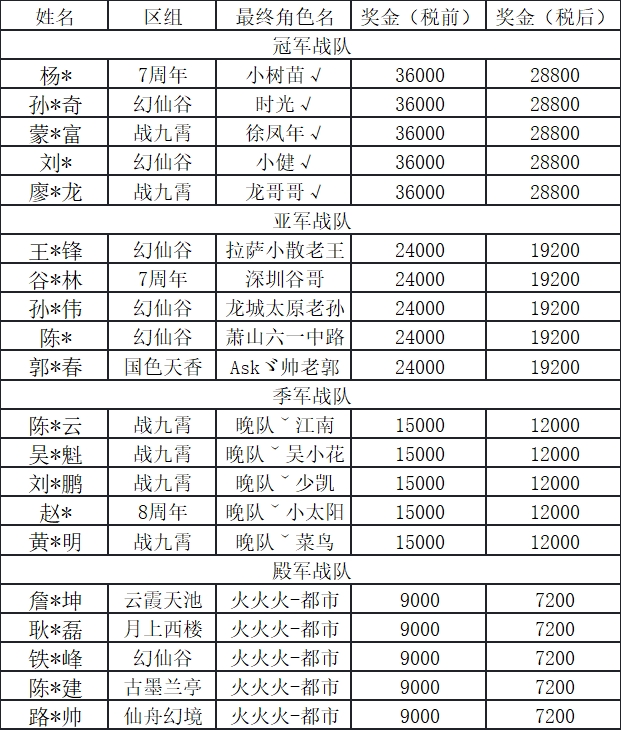 下面公布全民争霸赛四强赛玩家现金领奖信息,本公示将进行一周(12月17日-12月24日),若有道友对下述公示内容有异议,欢迎将具体情况投诉至工作人员邮箱:xul3@g-bits.com。若无收到投诉,则将在公示后5个工作日内进行奖金发放。