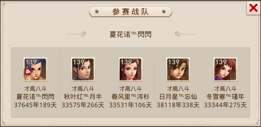 帥ゞ淺夏队是139中的顶级强队,在跨服试道中屡次位列前3甲,队中有3.6万年道的控金和控水,实力在所有队伍里也不容小觑。可惜他们首轮就遇到了水牧云拥有4万年道的〃胜浩ゞ队,速度和道行都不占优势,遗憾就此止步。