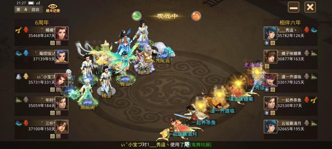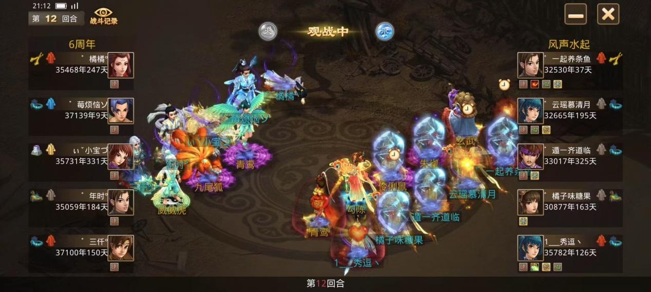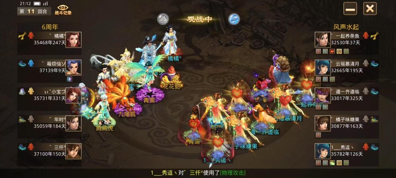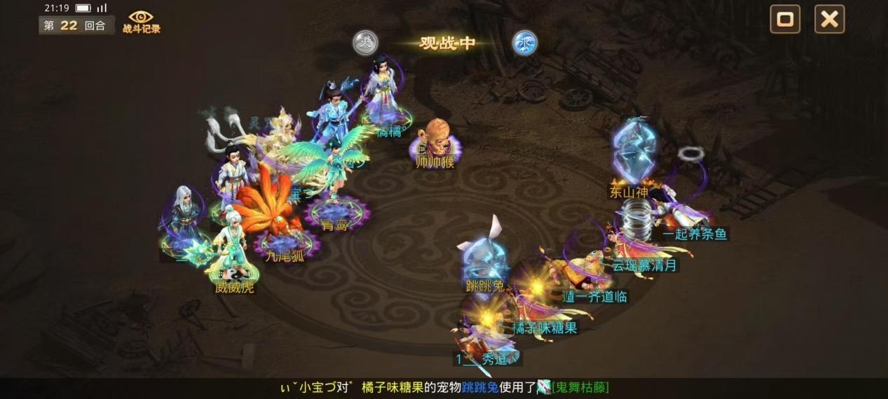 本局观战方是゛一起养条鱼队,平均道行上比对战方いˇ小宝づ队低了近3000年,但出乎意料在阵法上以水克火成功克制对手,抢得先手,在前10回合中稳扎稳打,凭借3个力的猛烈输出,清掉了对战方多只主力宠物。而对战方的控体水在被游说针对中卧薪尝胆,寻求翻盘的战机。