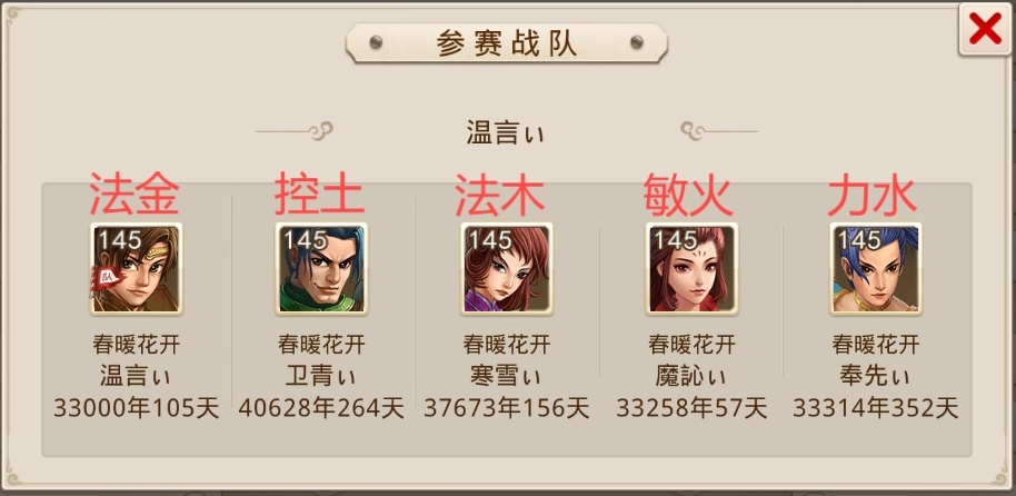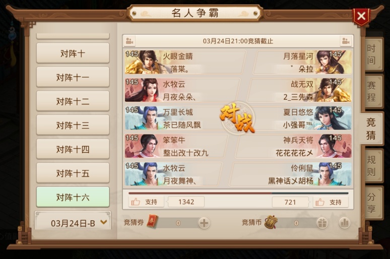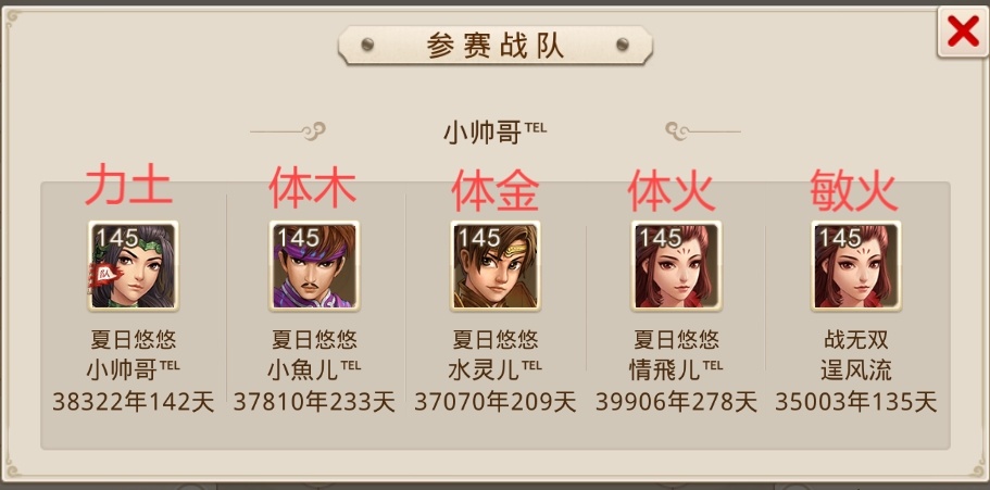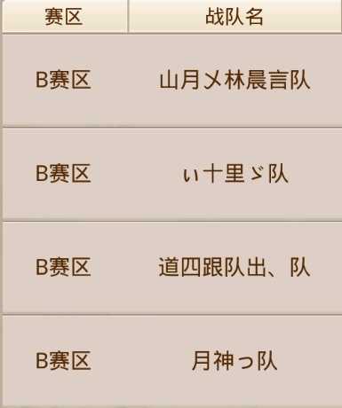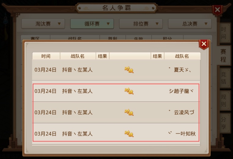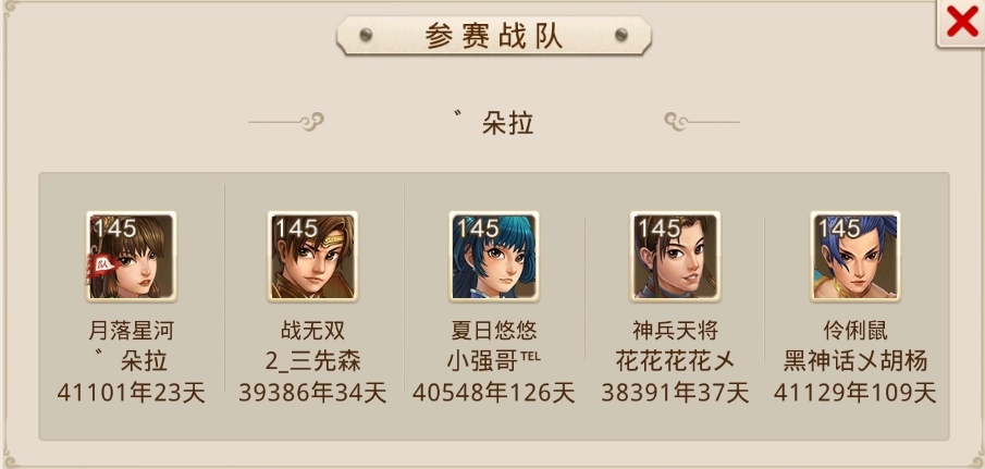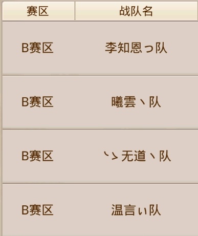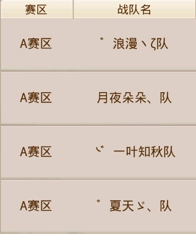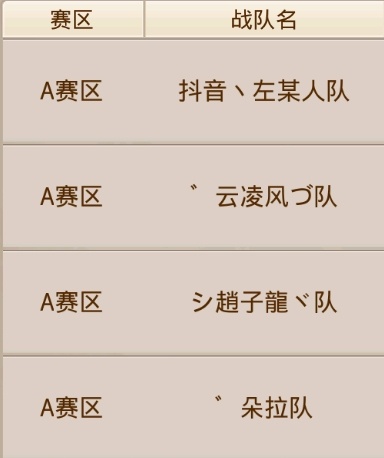 5周年-抖音左丶某人队、江湖年少-゛云凌风づ队、3周年-シ趙子龍ヾ队、月落星河-゛朵拉队、岁月流金-゛浪漫丶ζ队、水牧云-月夜朵朵、队、洪荒之力-╰゛一叶知秋队、镜花缘-゛夏天ゞ、队