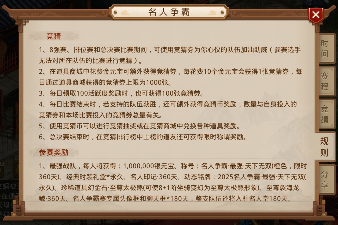 竞猜币不光可以参与抽奖,还可以直接兑换道具奖励。总决赛结束,竞猜排行榜上榜道友还可获得限时称谓奖励!