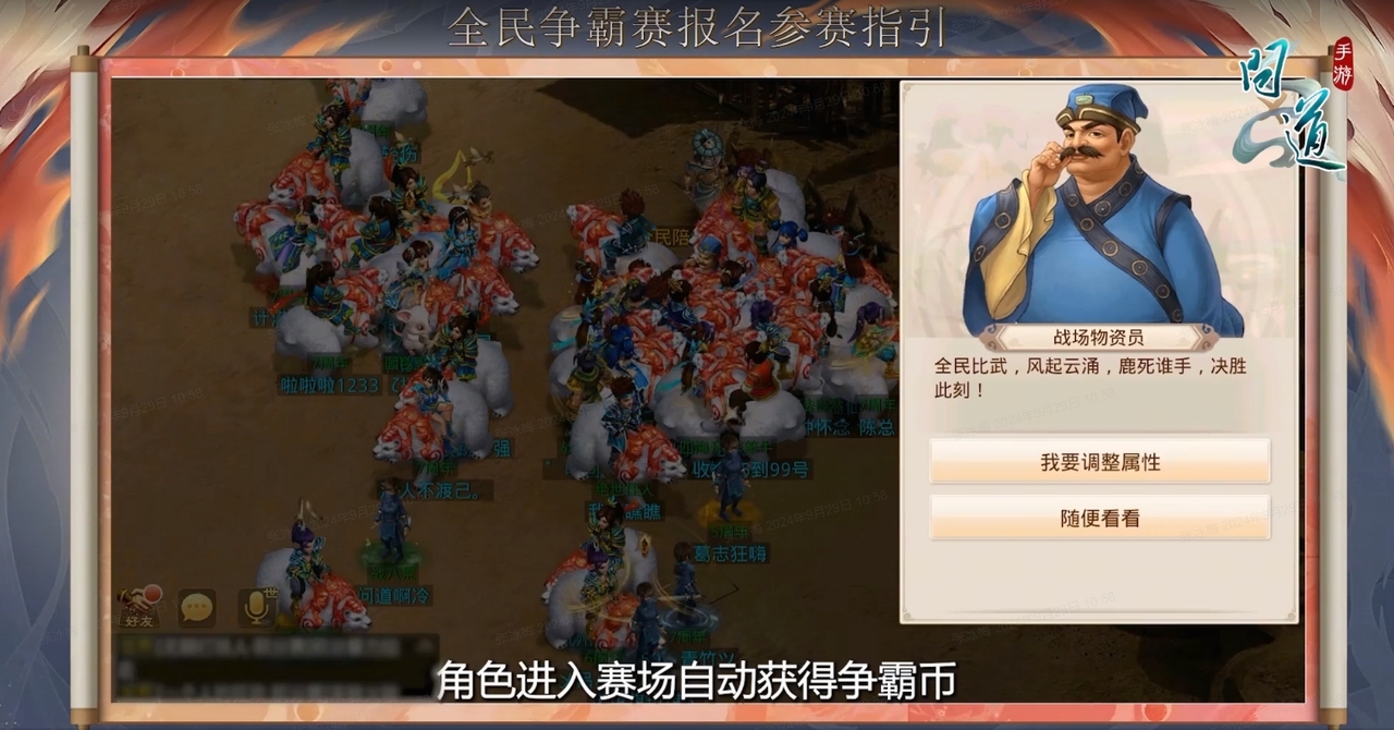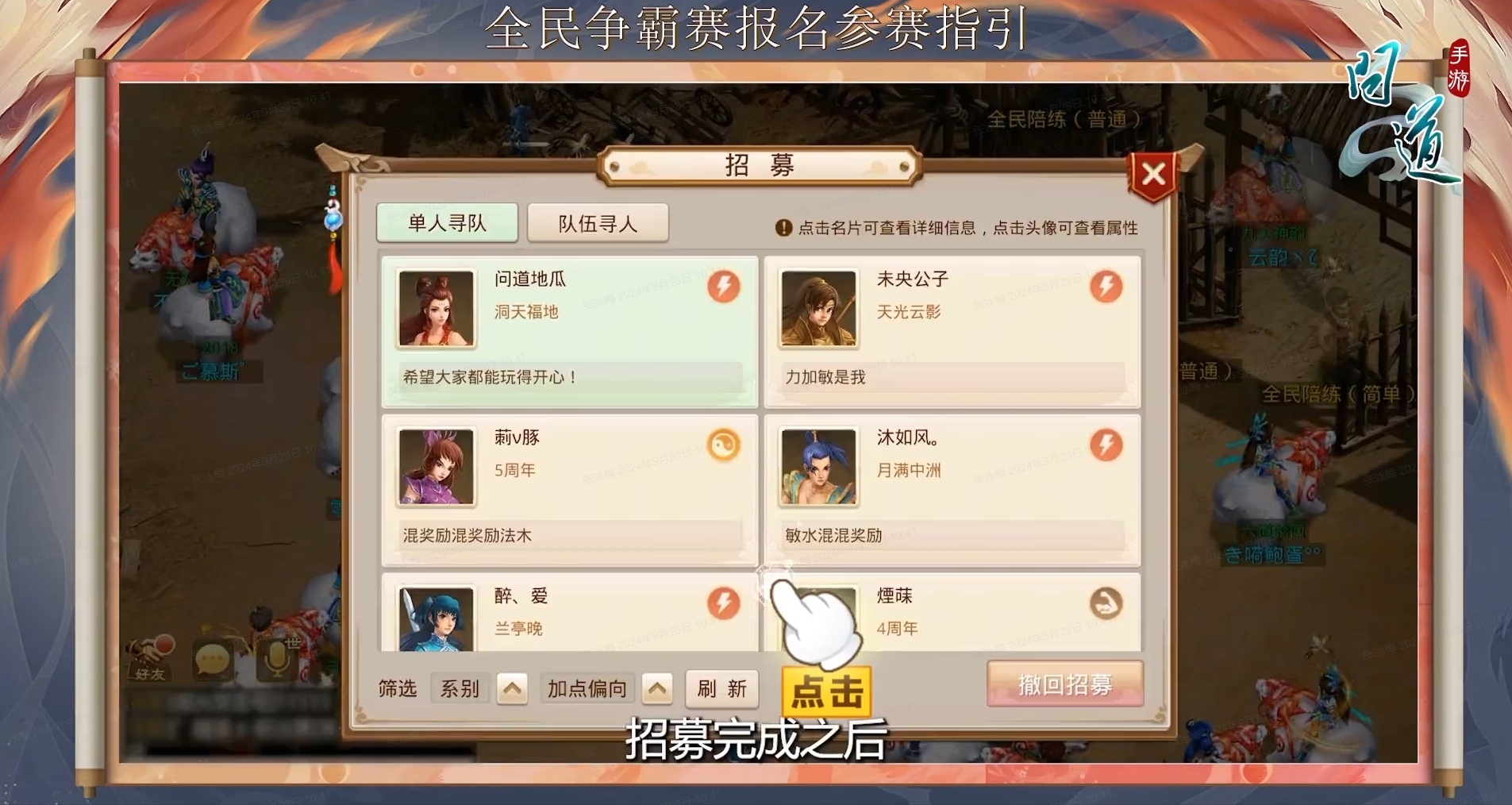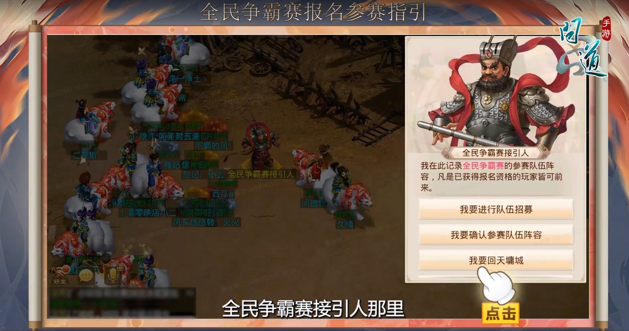 完成报名后进入热身赛场,找到全民争霸赛接引人,可以进行队伍招募哦~