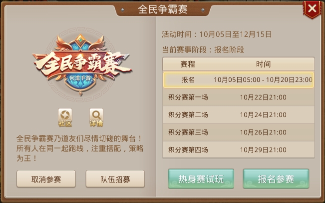 2025年9月27日05:00-10月12日23:00,热身赛在报名开启第1天08:00开始,和报名期同期结束~
