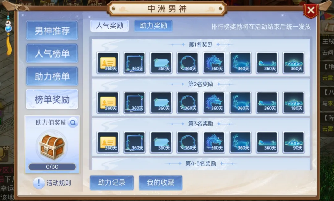 活动结束时,位于全服中洲男神榜前300名的道友,均可获得限时称谓、头像框、空间装饰等稀有奖励。拥有人气值的男性角色都将获得限时头像框奖励哦~