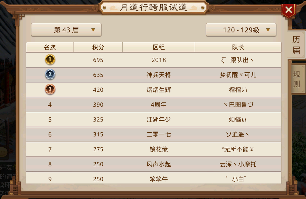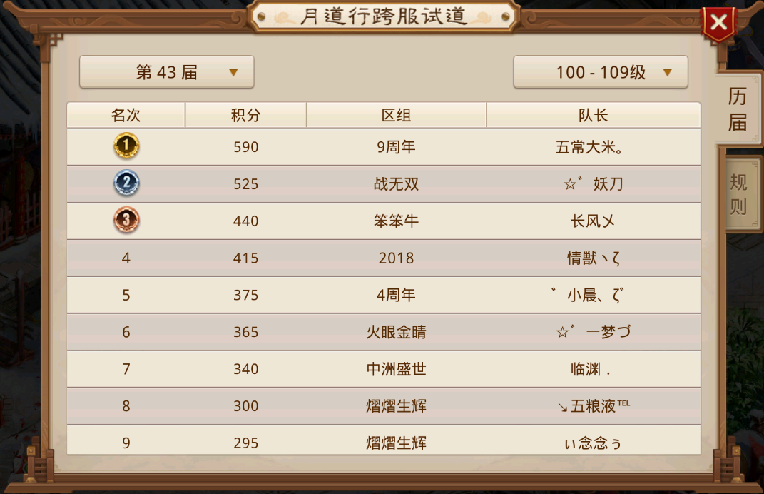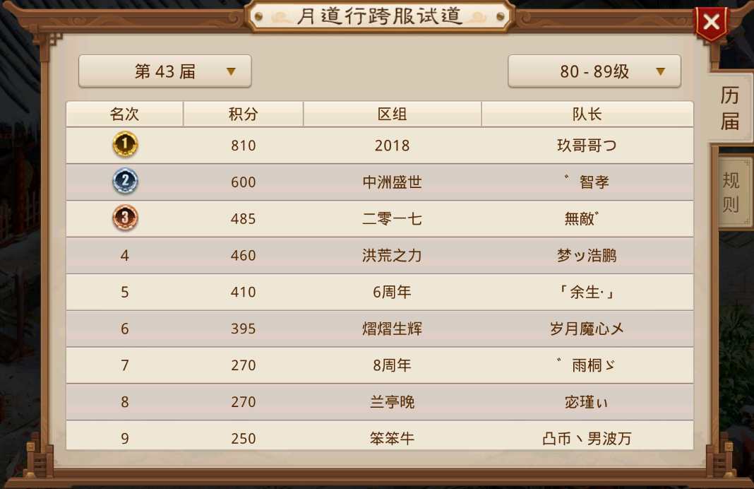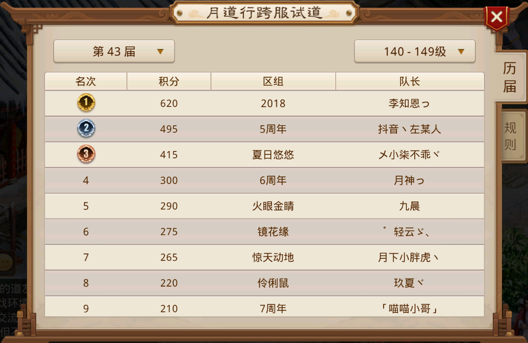 2026年第一届月道跨服试道已经结束,其中79、89 、145三个等级段重新夺回道尊之位,119、129、139三个等级段则牢牢卫冕道尊,延续自己的连胜纪录,而99和109两个等级段迎来了新王登基,这两个等级段曾经都是毫无悬念的比赛,如今99等级段杀出来一个7周年击败了三道尊火眼金睛队伍;而109在5周年队伍解散之后开始了群雄逐鹿,9周年从中杀出重围,两支队伍成为新的天下道尊。接下来一起看一下各个等级段的具体情况吧。