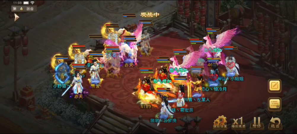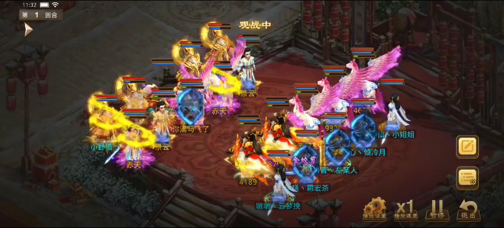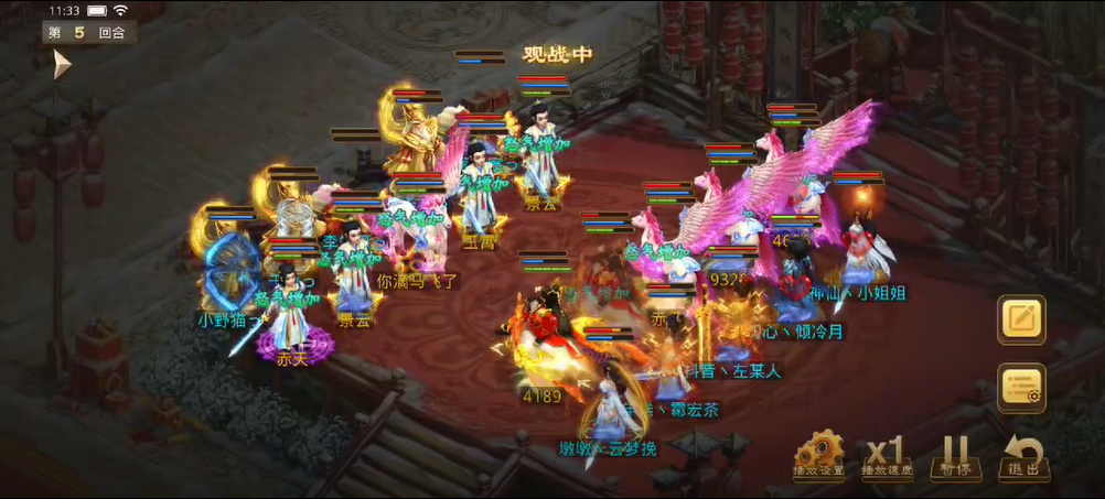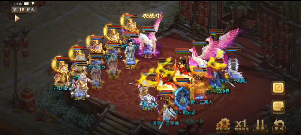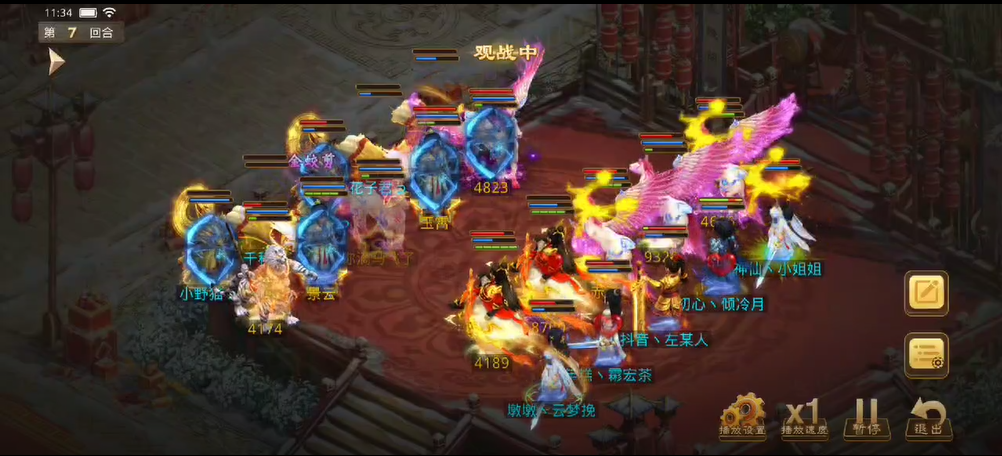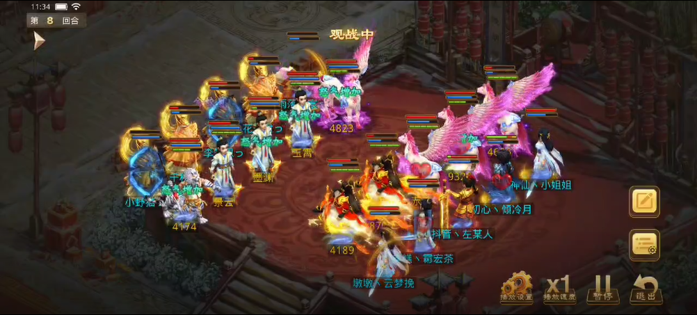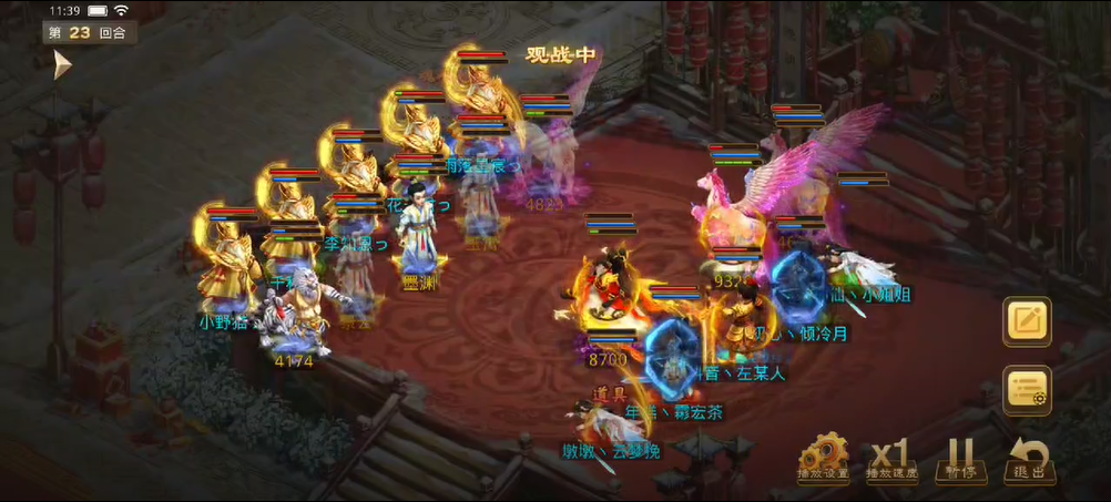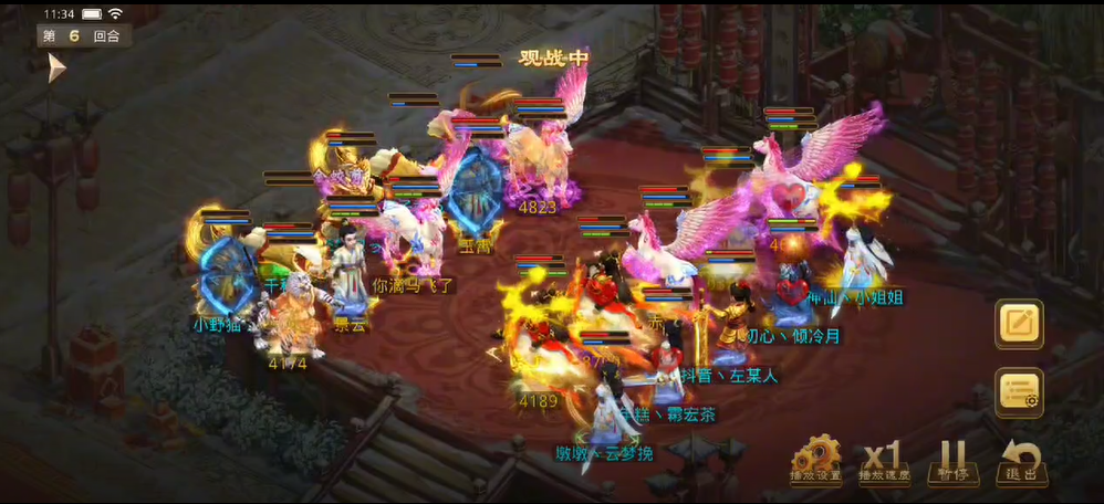 观战方敏火解除障碍后继续补速度,宠物用束手就擒限制对战方法金,也用闻风丧胆限制了对战方控火,对战方同样用宠物束手观战方法木,闻风观战方控火时失败,观战方控火出手只障碍上对战方的控火,对战方用宠物将力木打醒,出手将观战方敏火打倒并附上混乱状态,而敏火的宠物出现失误普攻了观战方(应该是时间到了没来得及操作)。