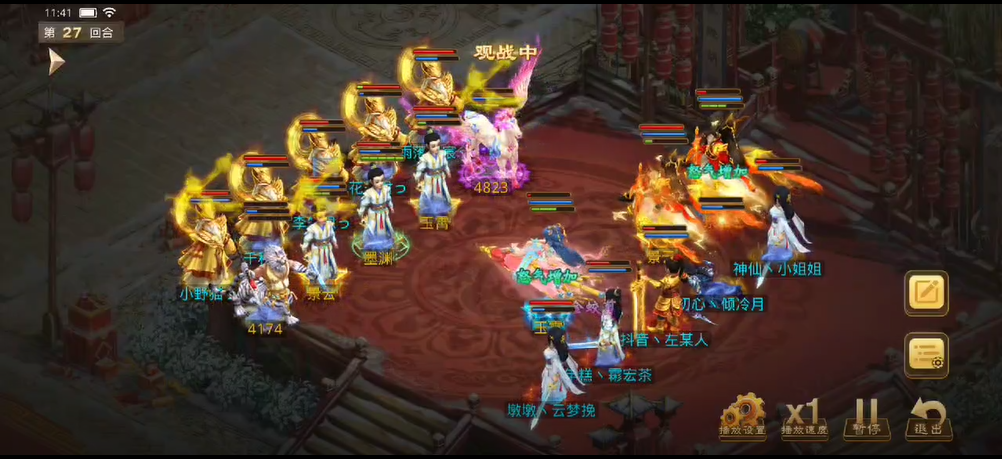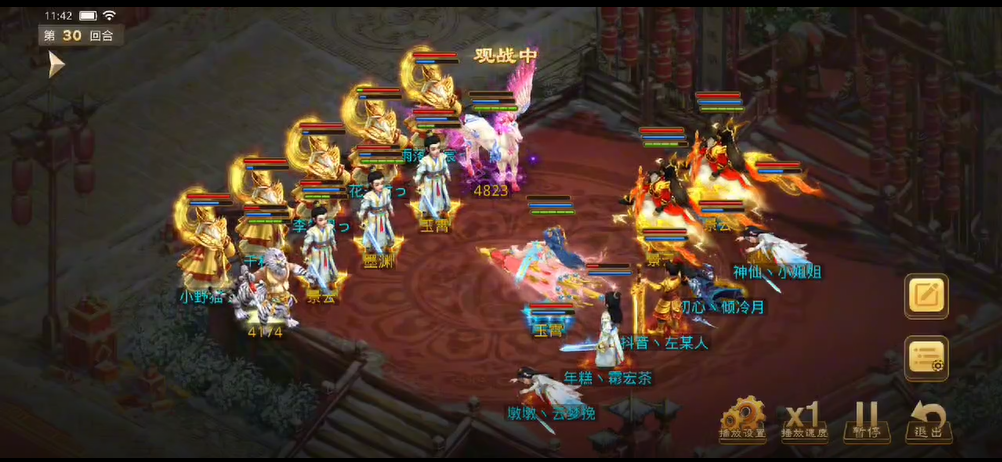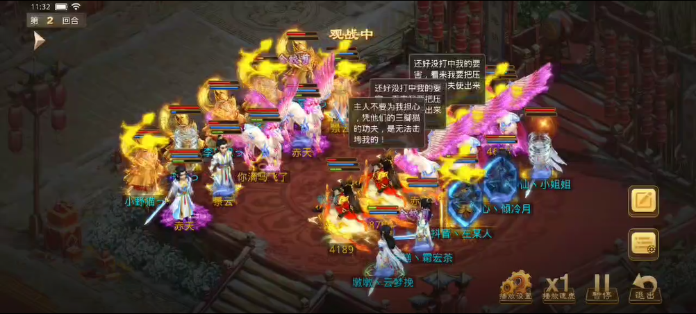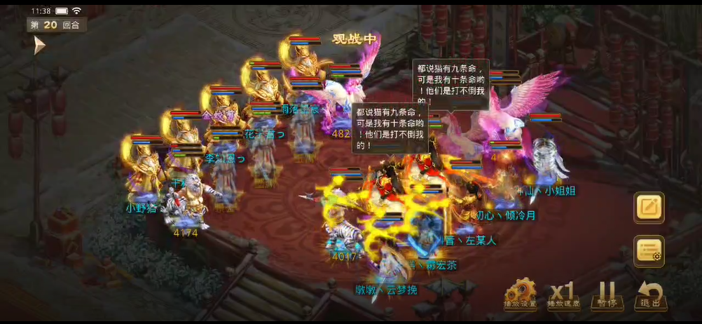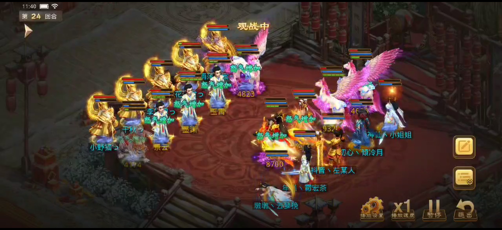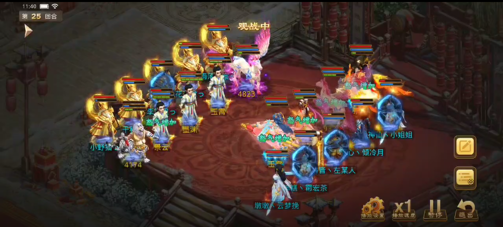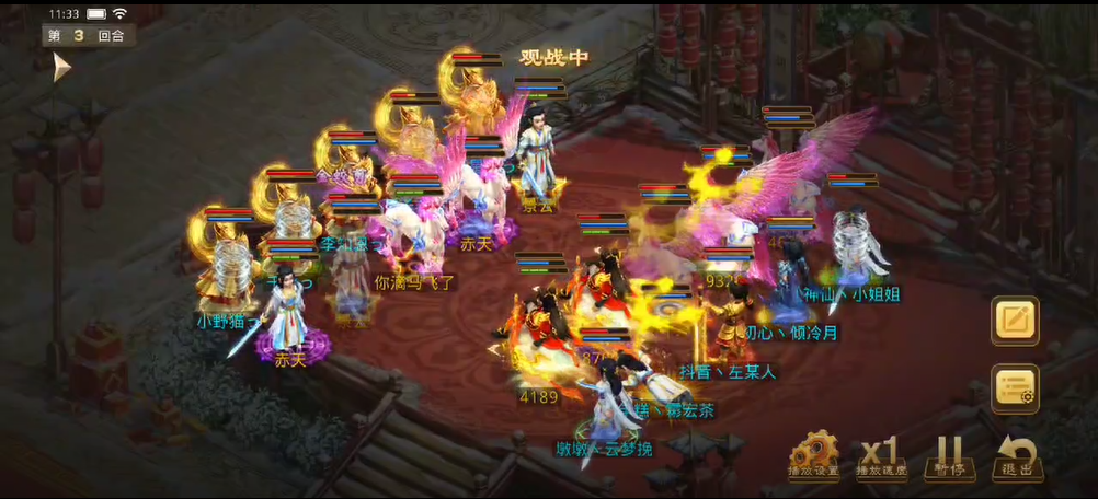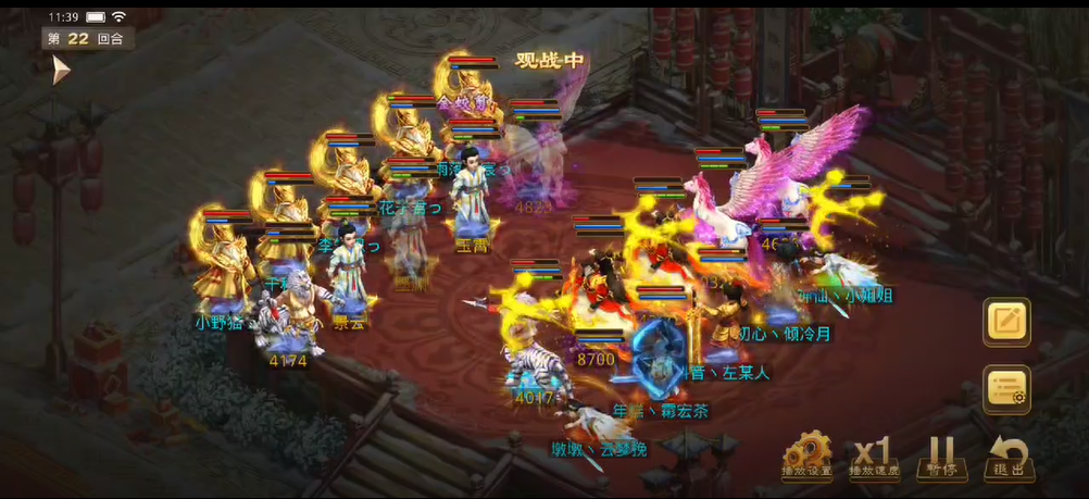 观战方补上速度后将对战方法金束手就擒,控水出手冰上了3只宠物和敏火,对战方控水也立马反击,出手冰上了观战方的4个人物。力木全力输出宠物,再次清掉了观战方的2只宠物。