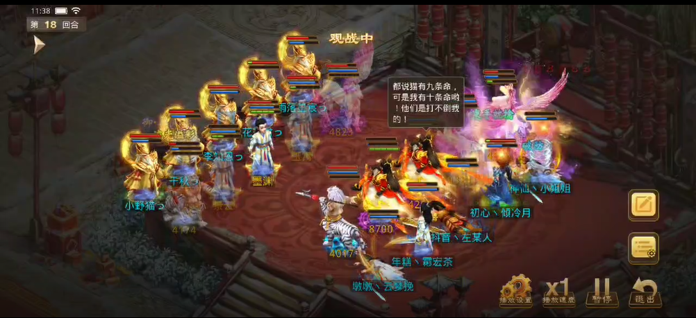 观战方用两只宠物抽掉了对战方控水控火的蓝,对战方也用宠物抽掉了观战方法木的蓝,对战方拉起敏火后继续为队伍补上速度,观战方睡火出手障碍上对战方的4个人物和1只宠物,对战方用宠物打醒法金,法金出手打掉了3只元灵的1次复活次数。