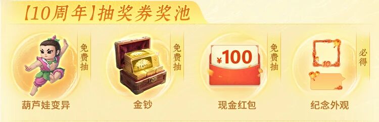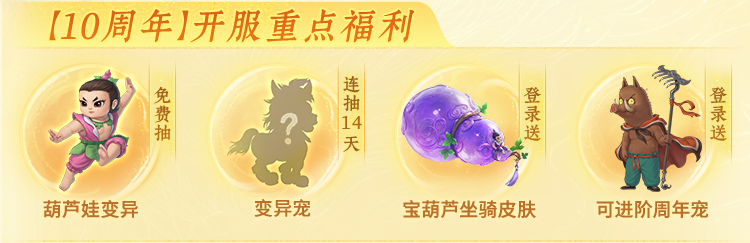预约【10周年】即得生日券,可在4月24日开服当天抽葫芦娃变异宠等奖励!