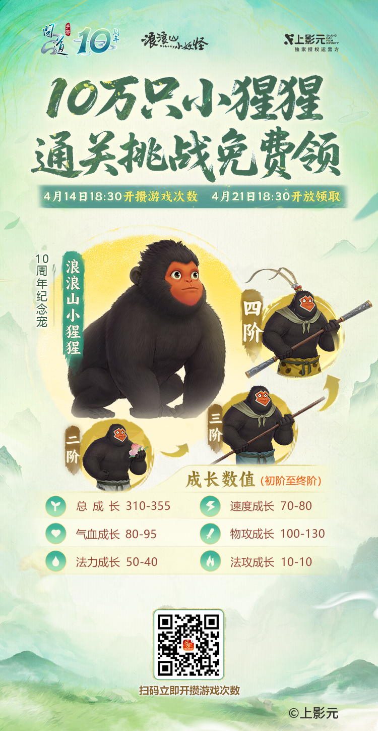 大家不要忘了在4月21日18:30准时开领周年宠浪浪山小猩猩,先到先得!