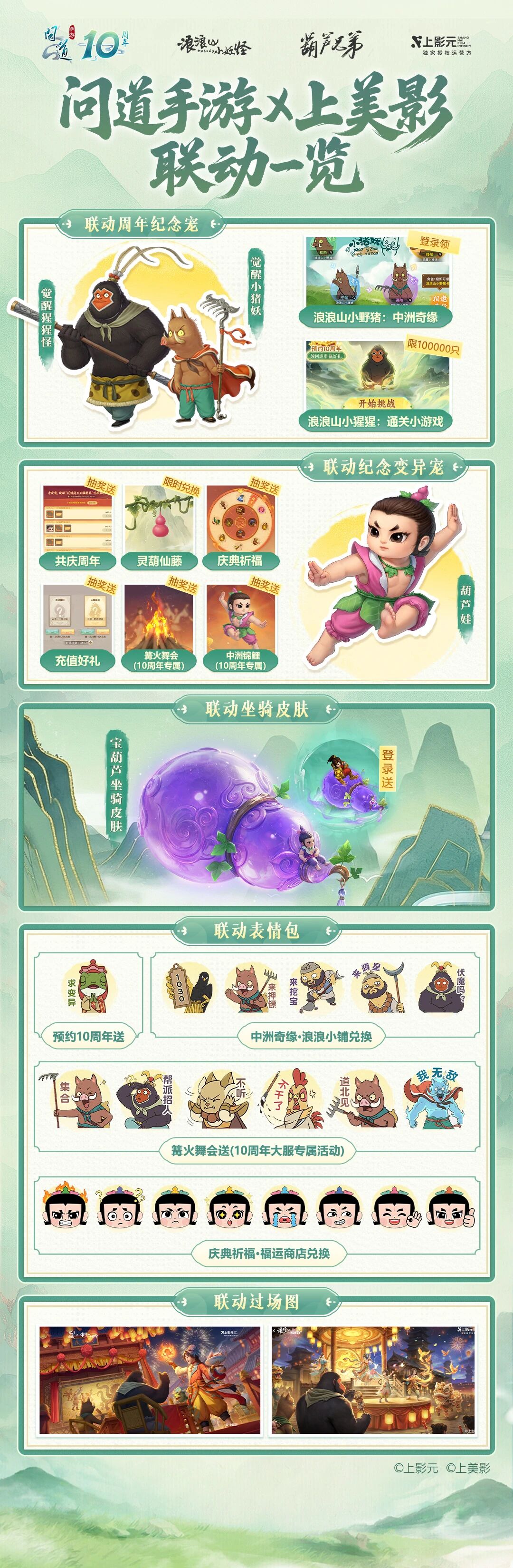 10周年不仅联动了《浪浪山小妖怪》,还联动了经典电影《葫芦兄弟》,所有联动内容看这张图就够了!明天地瓜将带来 葫芦娃变异的详细爆料~