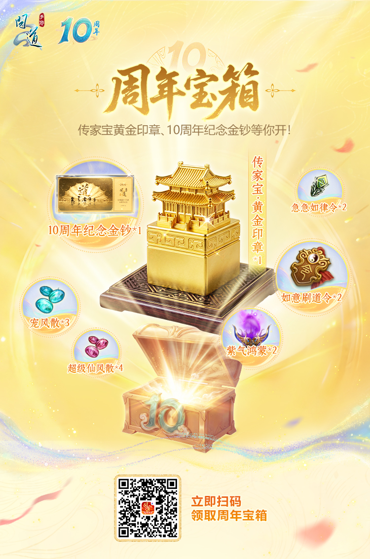 查看修行数据后,还能根据账号历史资历数据,免费获取0-5个周年宝箱,开启宝箱将有机会抽出传家宝金印、10周年纪念金钞!保底也能获得道具奖励!