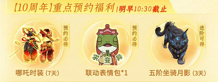 预约必得的爆满礼包、哪吒时装*7天、联动表情包、免费抽的小猩猩、纪念金钞,明早10:30截止享受!