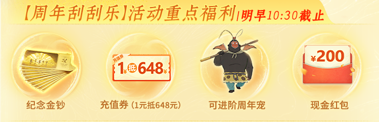 明晚20:40-20:45期间,将进行【共庆周年】抽奖,凭生日抽奖券就有机会抽到葫芦娃变异、整箱纪念金钞哦~