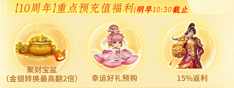 预充可享的15%返利、聚财宝盆、幸运好礼预购享折扣等充值福利,明早10:30之后就不能再享受啦!