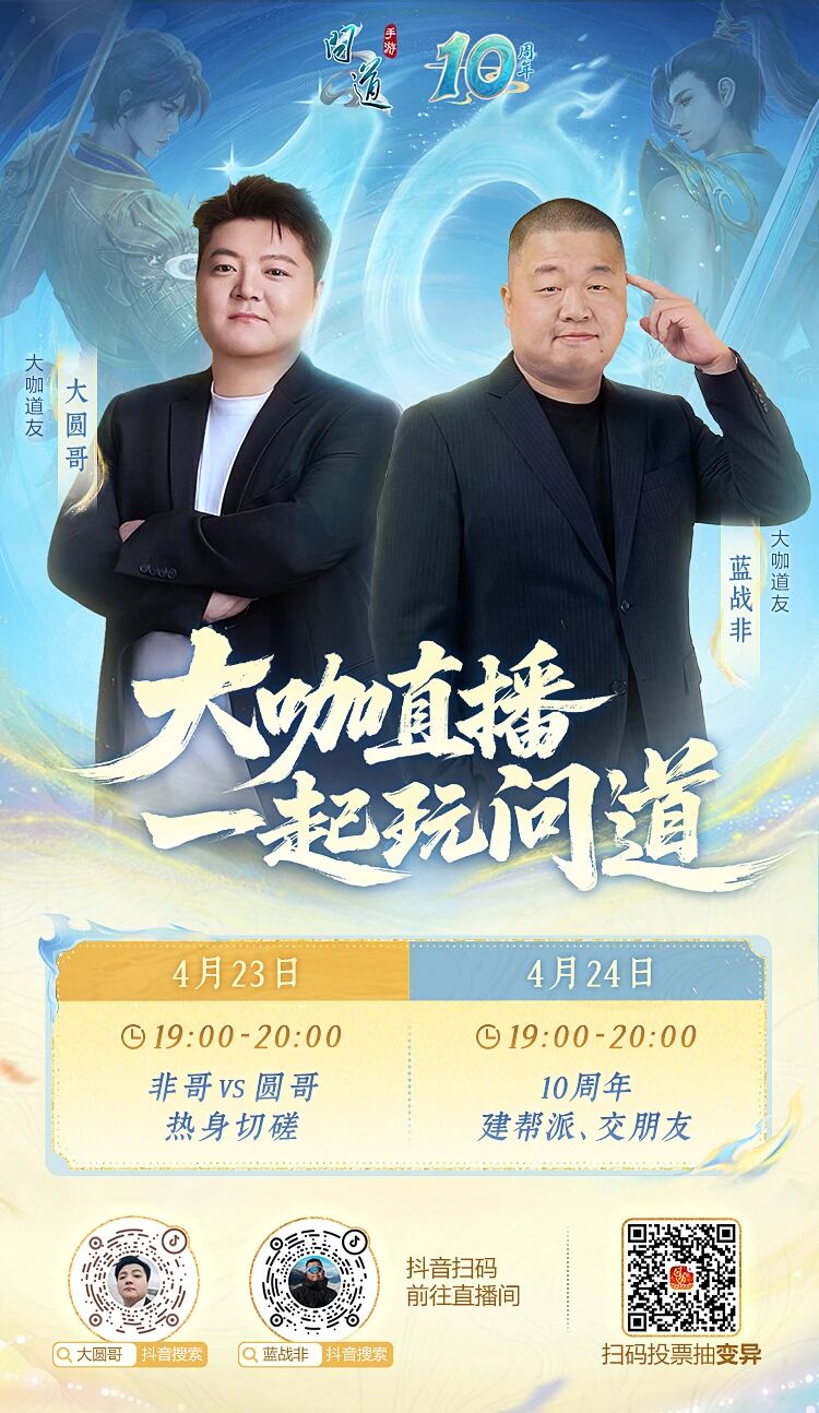 明天开服后,大圆哥和蓝战非还会持续开播,分享自己在【10周年】的圆梦进度,和道友们一起做装备、做宠物、交朋友,可以参考这份直播计划,来直播间跟他们互动~