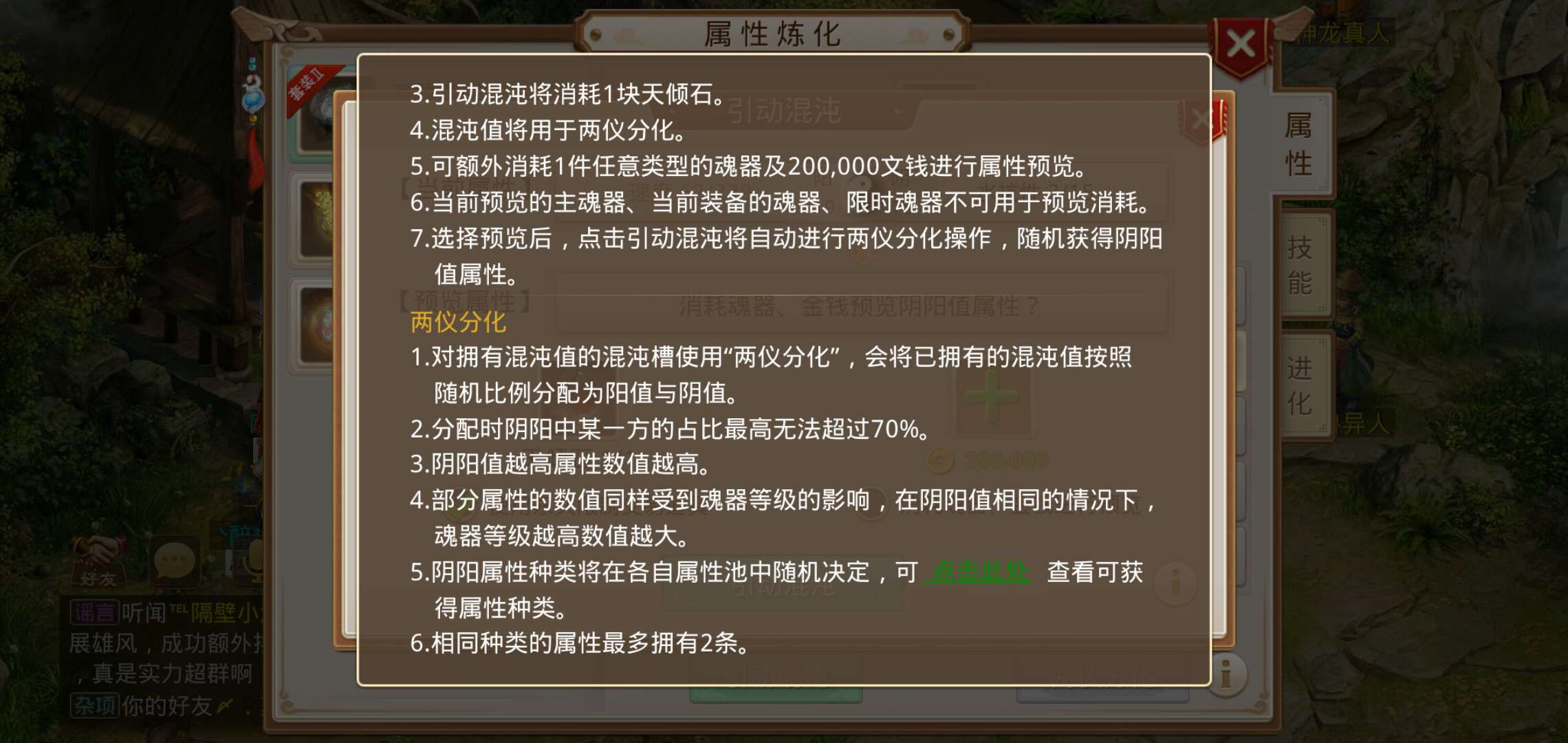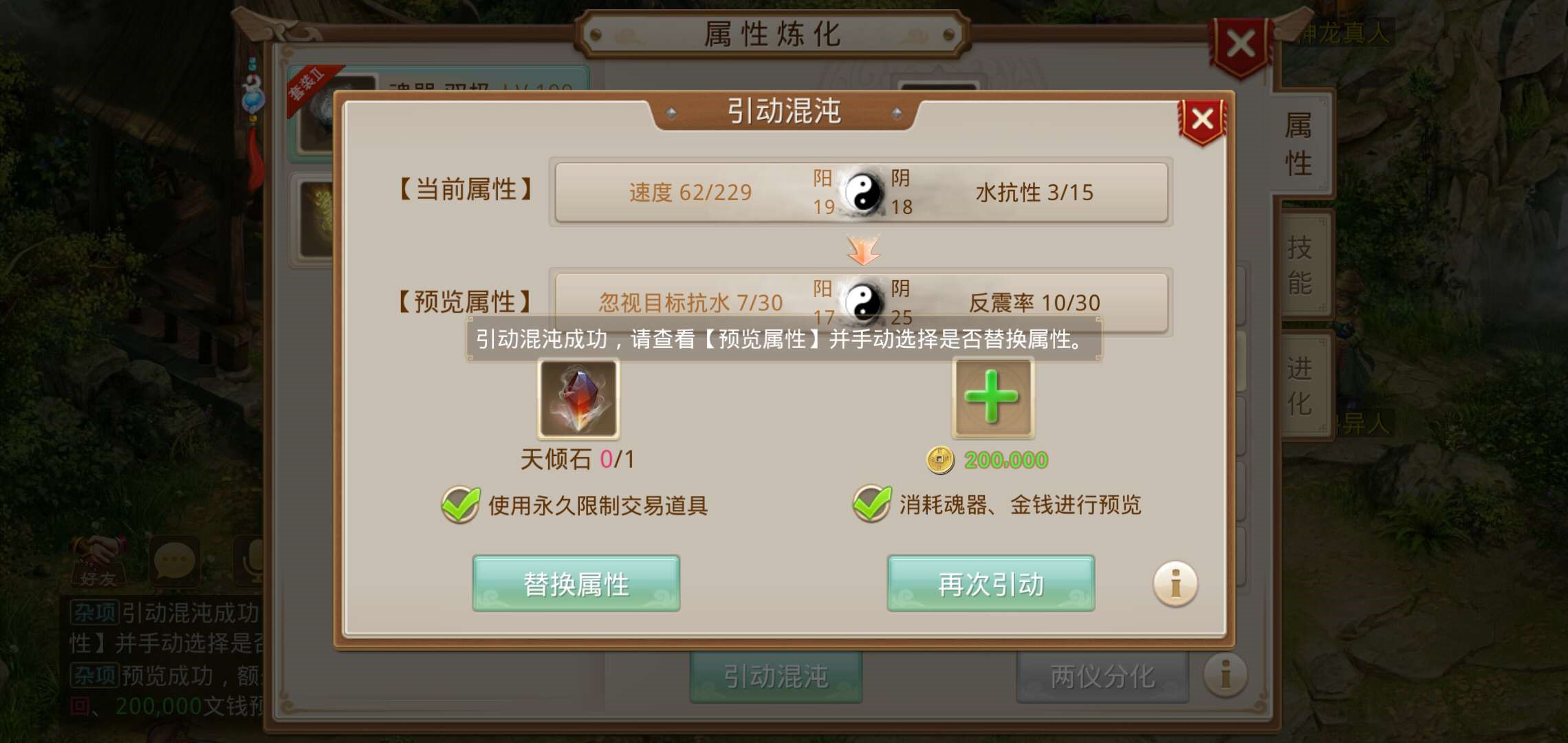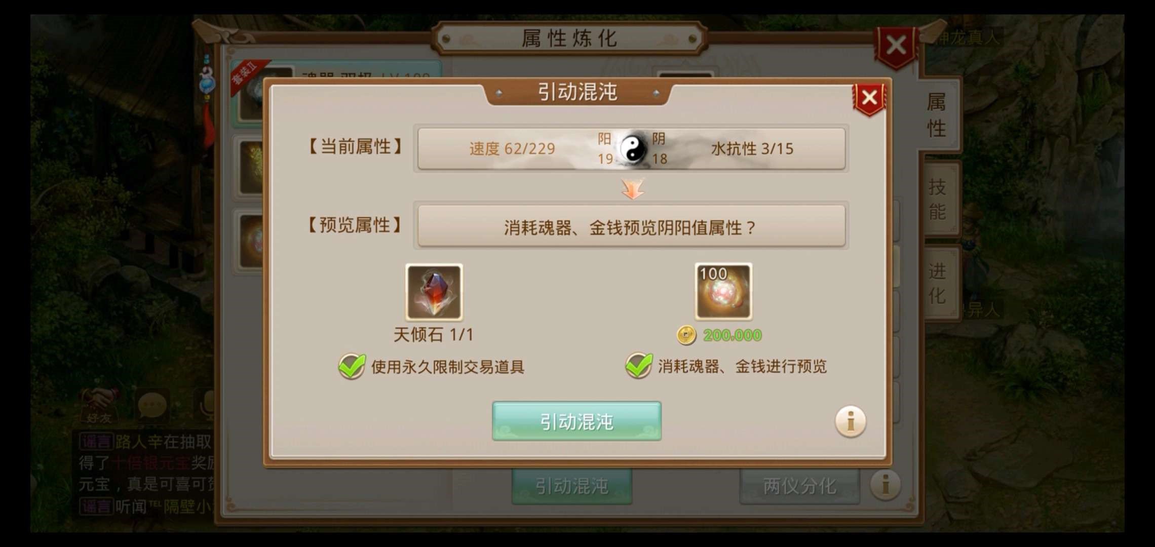 1、预览一次消耗1件任意魂器+20w游戏币。哦对了,还有一块天倾石,前面魂器和金币是预览消耗,天倾石是引动混沌消耗,毕竟,要换属性首先得引动混沌不是?