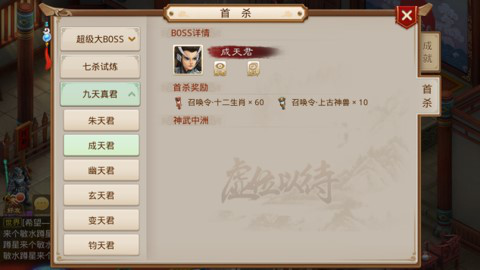大家好,我是二哈哥哥,今天给大家要聊的是九天真君第五关,九天真君boss第五关的奖励比第四关还要丰富。通关后除本身的道行+随机道具等,单人还可以获得60个变异牌子+10个神兽牌子以及永久橙色称号一个。