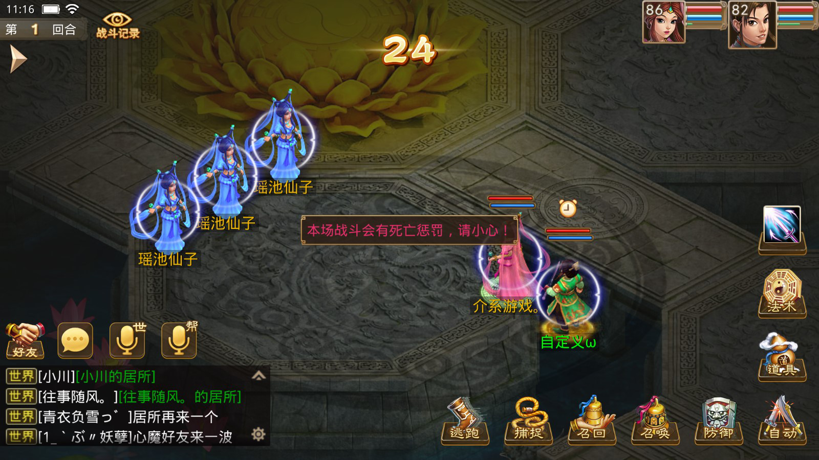 第一次战斗为瑶池仙子,难度:简单,血量低,速度慢,可被障碍,有几率触发番天印法术连击效果。正常宝宝带速度妖石就比瑶池仙子速度快,这样就可以随便打,不需要害怕人刚被怪打死,宝宝就收对面人头导致自己死亡的情况。 不过比较双拳难敌四手,新手玩家建议一一杀,集火秒杀,人倒地之后宝宝立刻把人拉起来,这样子就很简单了。