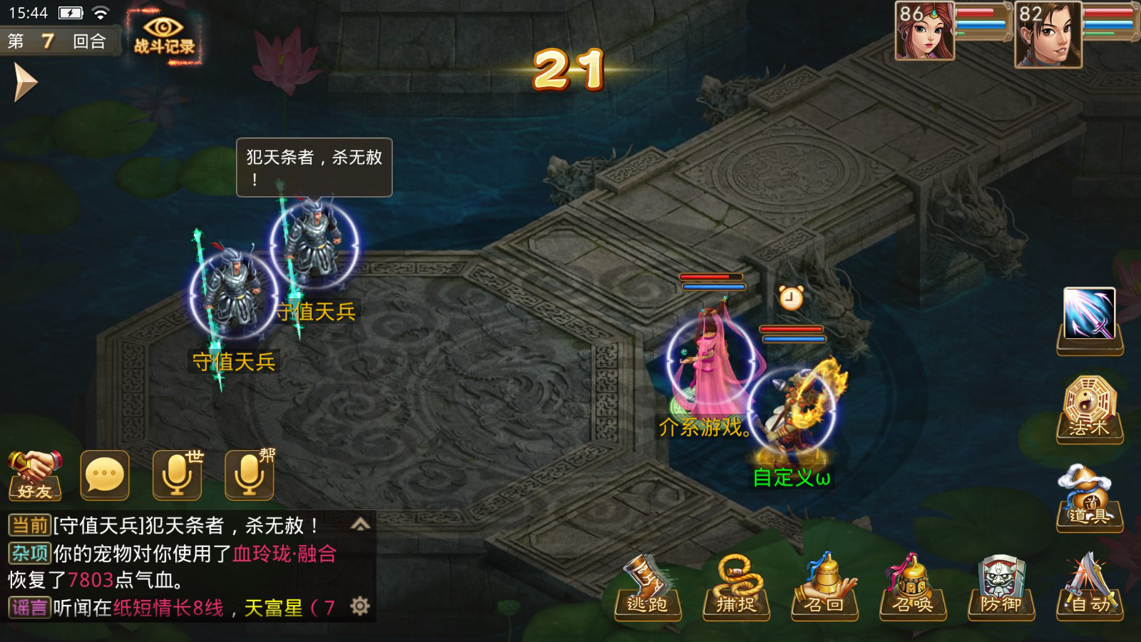 第二次战斗为守值天兵,难度:简单,血量低,速度慢,可被障碍,几乎与瑶池仙子难度相同,唯一不同之处在于,在守值天兵血量见底的时候,有几率触发混元金斗的效果,道友要着重小心这个时候,以免处理不当导致翻车。血量低的守值天兵会喊话“犯天条者,杀无赦!”,这个时候建议道友首先将喊话的天兵消灭。