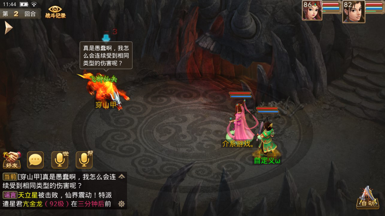 第三次战斗为穿山甲,也是本次梦境中的大boss。难度:一般,血量高,速度极慢(不带速度妖石的宝宝都比它快),可被障碍。特性为,需要物理攻击与法术攻击轮流攻击,一次物理,一次法术,不然就会出现下面这种“-3”外加被穿山甲嘲讽的情形。