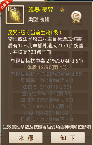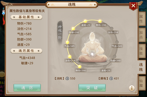 神魂分阶位,每阶有十层,十层突破完成阶位提升。首先,神魂突破需要消耗阴德,阴德通过地宫探险获得;其次,神魂阶位的每层都有属性加成,但加成属性只在地府中生效;另外,神魂每提升一阶,魂器可生效的属性多一条,且可生效的技能等级提升1级。例如我现在神魂只有一阶,那么当前魂器仅第一条属性生效;魂器技能等级虽然是3级,但可生效等级仅为1级。