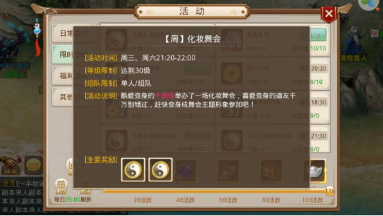 化妆舞会活动可在活动---限时活动中查看,在每周指定日期的21:30—22:00开启,若道友想要参与活动,在等级大于等于30级后可在活动开启前,前往天墉城的千面怪处参加活动。